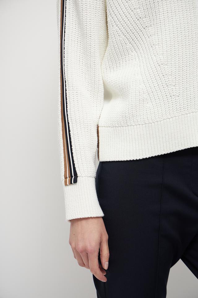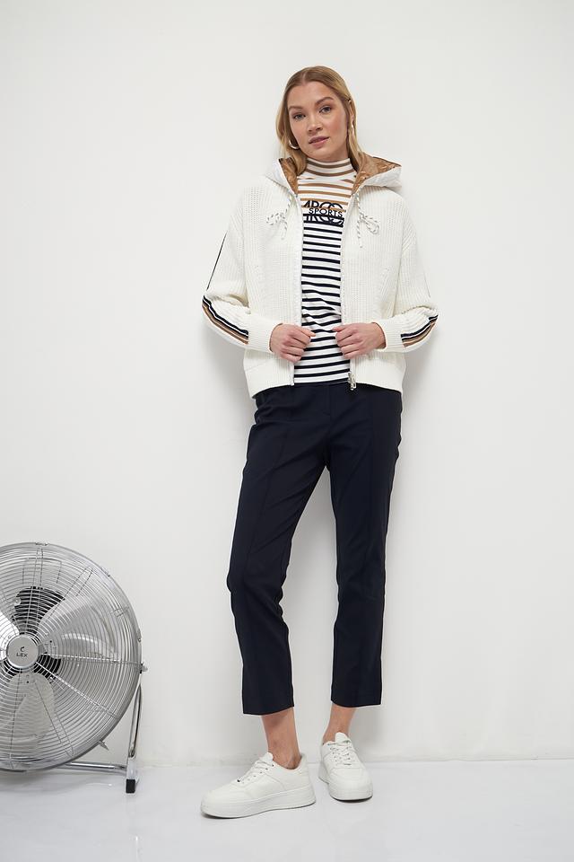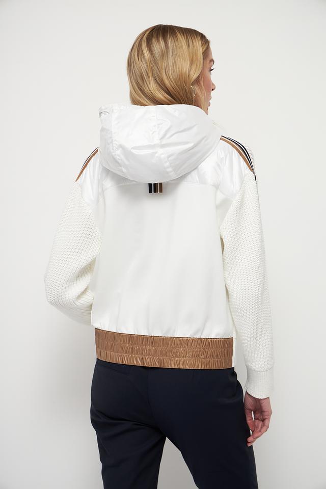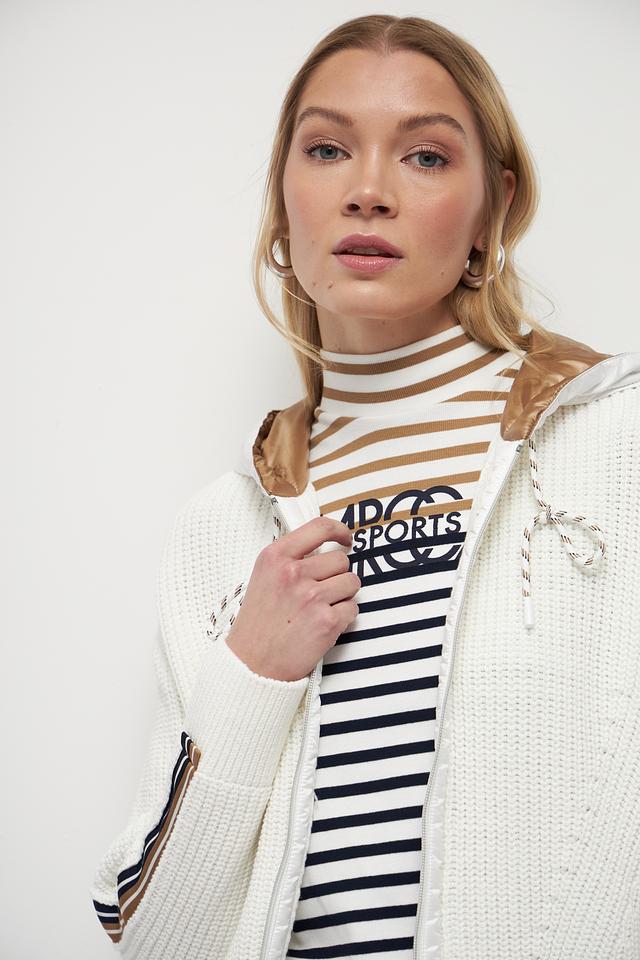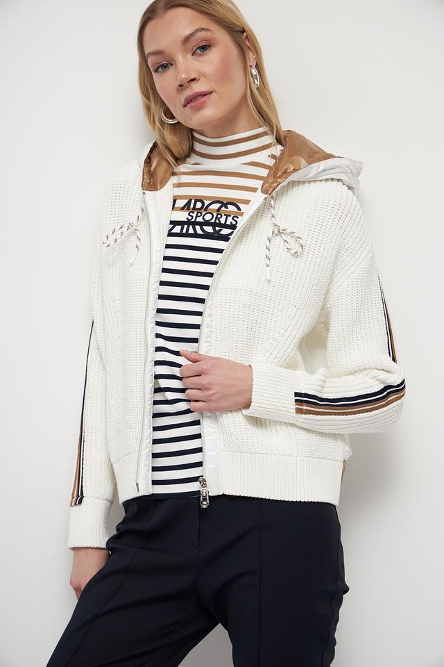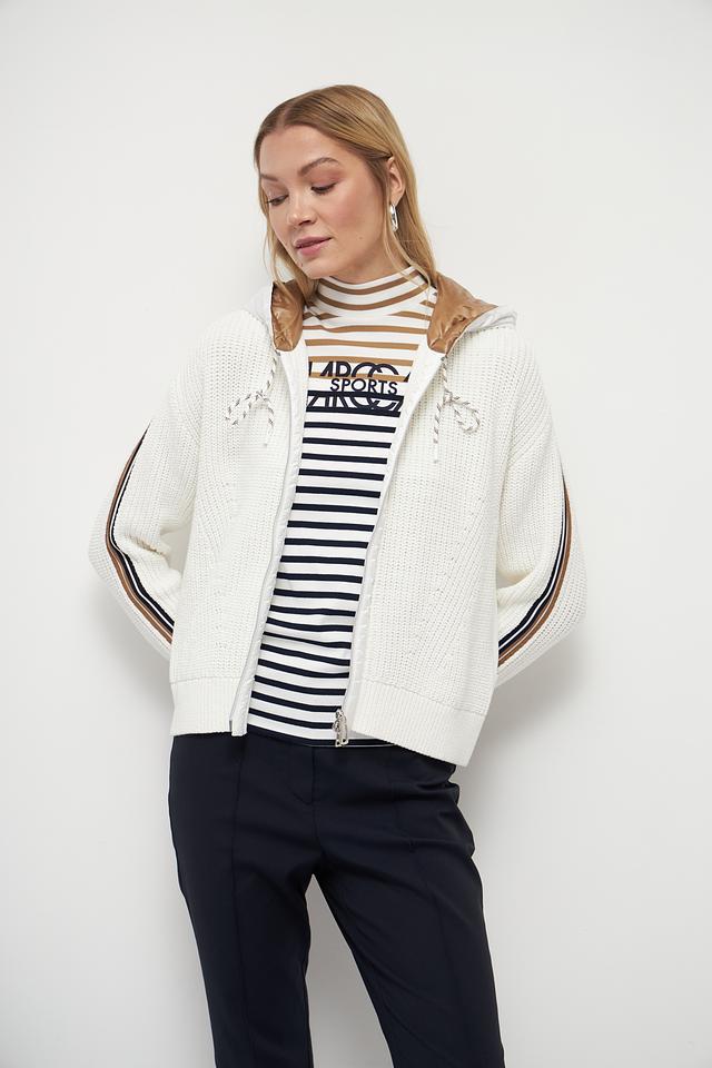 Белый жакет Marc Cain из хлопка с полиэстером, выполненный с декоративными полосками и капюшоном. Застежка – молния. Состав: 90% хлопок, 10% полиэстер. Состав: хлопок 90%, полиэстер 10%