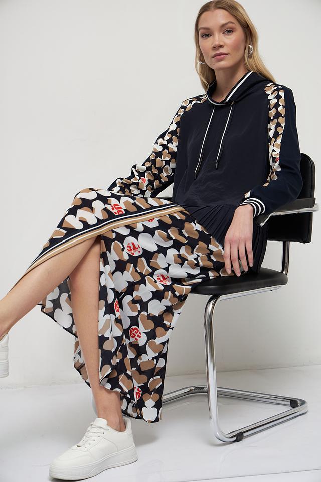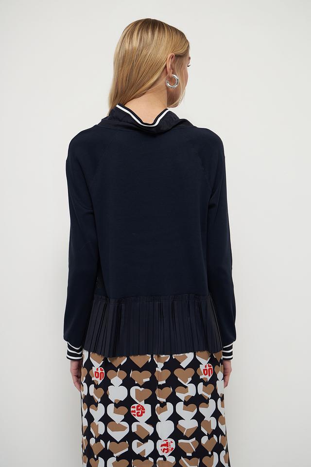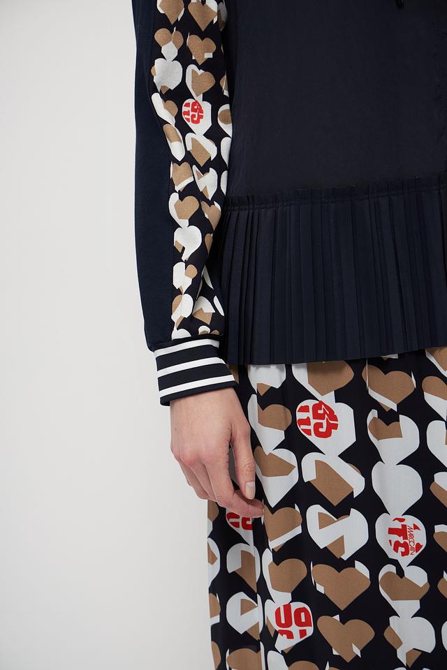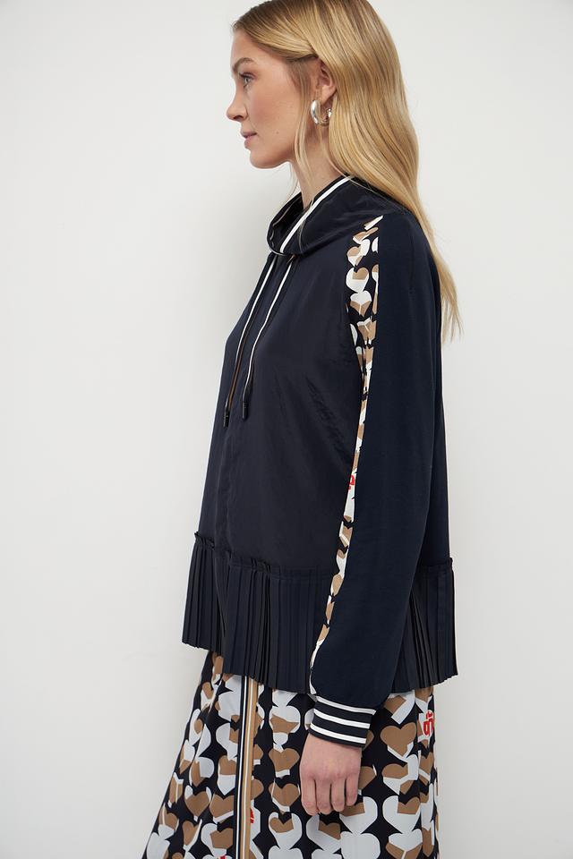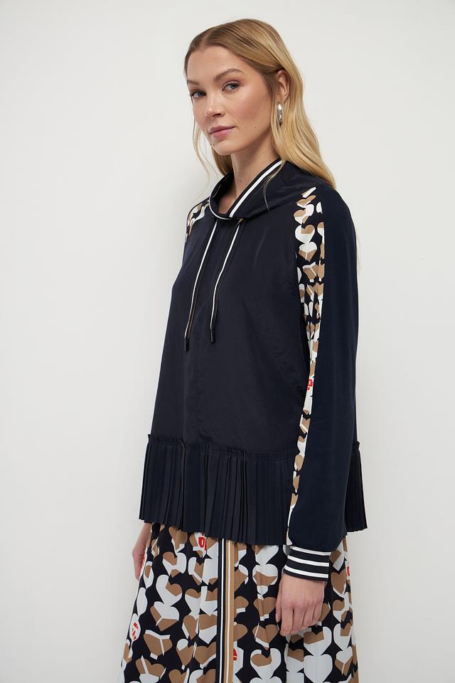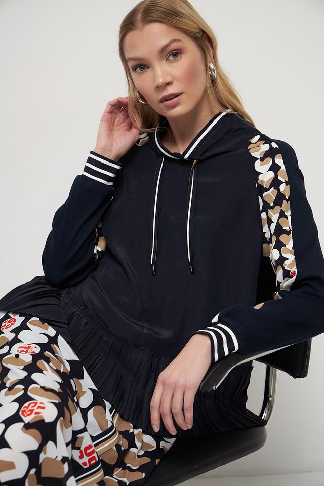 Модель имеет капюшон со шнурками, а также полоски на рукавах, добавляющие динамики дизайну. Рукава длинные, с манжетами. По низу блузы – декоративная плиссированная вставка.