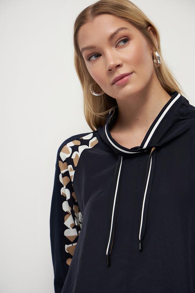 Стильная блуза Marc Cain черного цвета с капюшоном и полосками на рукавах. Изготовлена из хлопка с добавлением эластана для комфорта и свободы движений. Состав: хлопок 94%, эластан 6%