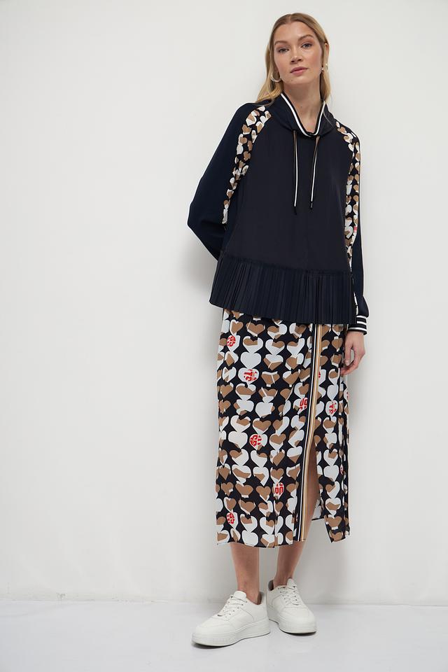 Юбка имеет длину миди и прямой крой, что делает ее универсальной и подходящей для различных типов фигур. Главная особенность – это оригинальный принт в виде повторяющихся сердец коричневого цвета на черном фоне. Дополняют образ белые и красные элементы, создающие контрастный и запоминающийся дизайн.