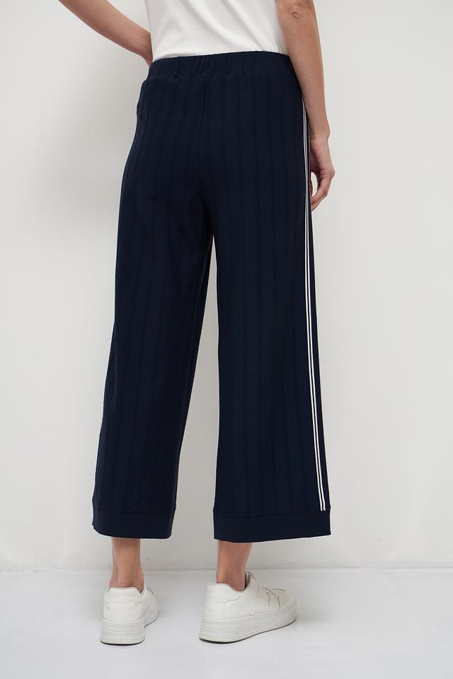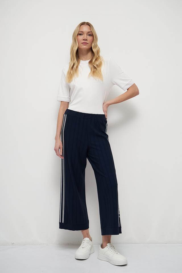 Дизайн брюк включает в себя эластичный пояс для удобной посадки, а также контрастные белые полосы по бокам, добавляющие спортивный акцент. Крой брюк – свободный, к низу расширяющийся, что обеспечивает свободу движений и создает современный силуэт.