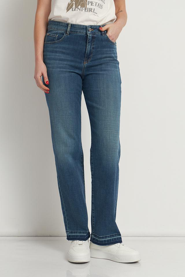 Женские джинсы Marc Cain голубого цвета в стиле casual с прямым кроем и эффектом потертостей. Модель выполнена из качественного хлопка с добавлением эластана для комфортной посадки. Состав: хлопок 92%, эластомультиэстер 6%, эластан 2%