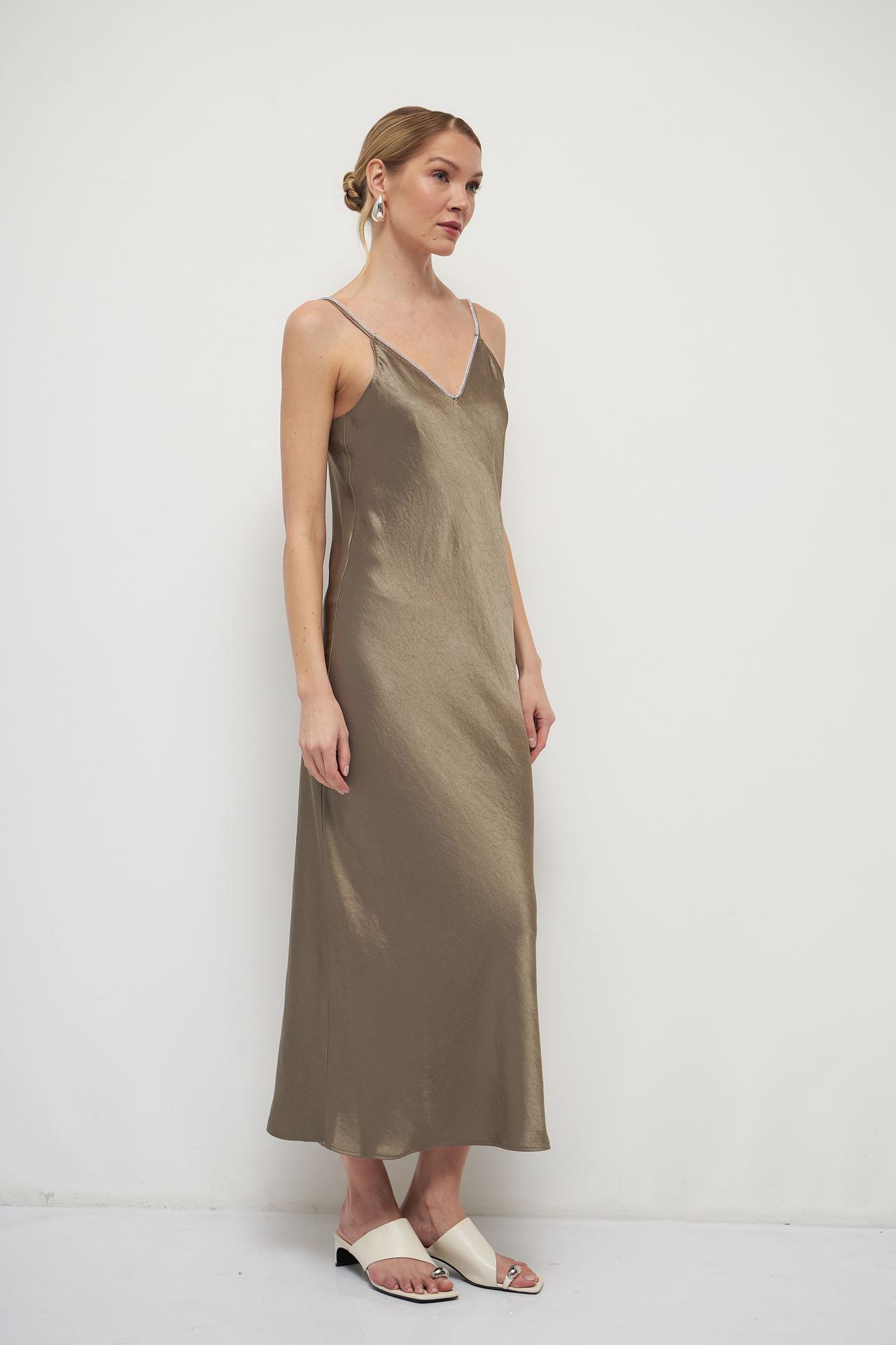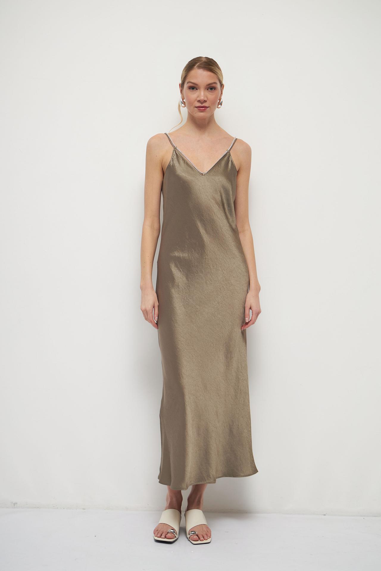 - Дизайн. Лаконичный крой, изящные бретели с серебристой отделкой и глубокий V-образный вырез делают платье подходящим для любого случая.