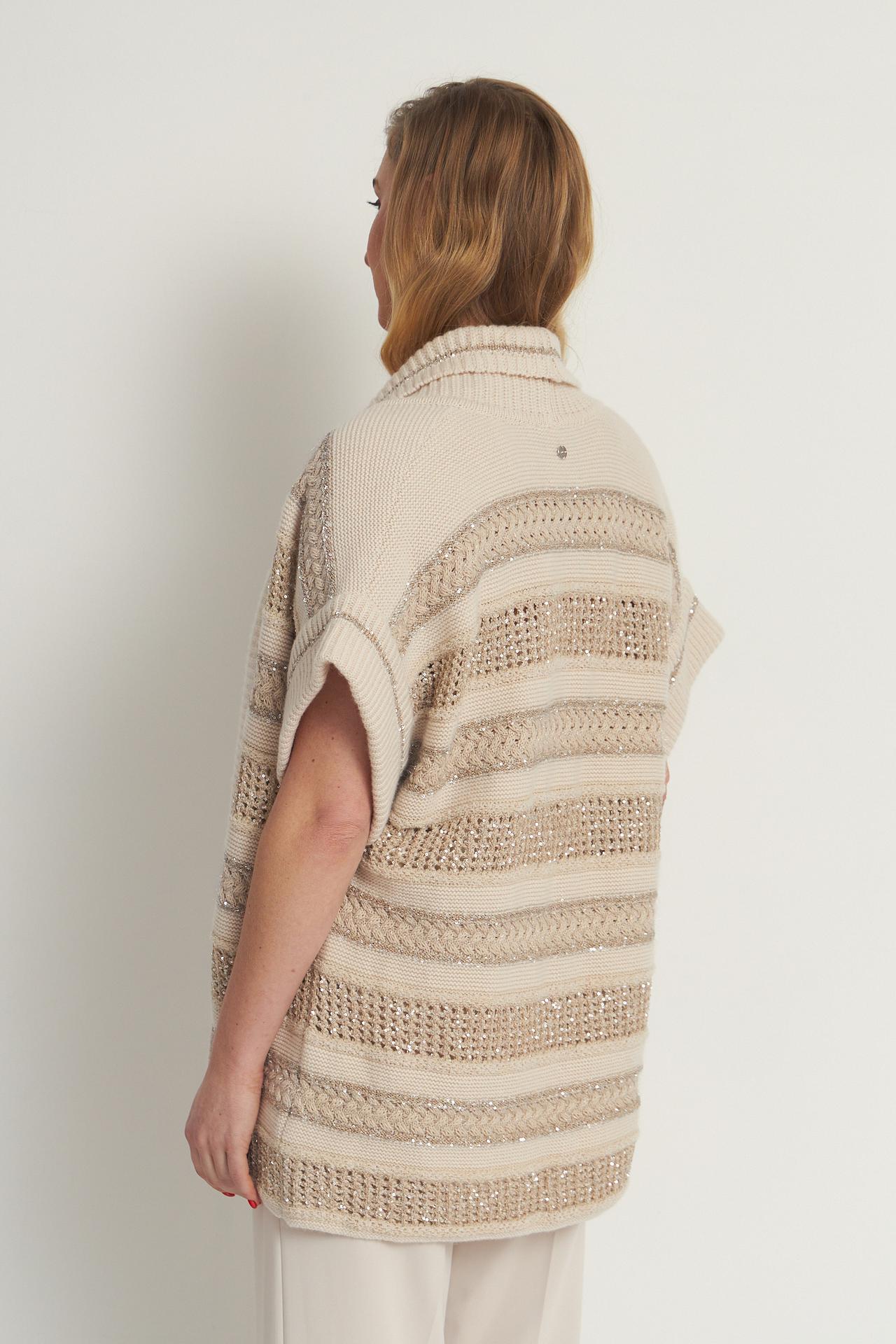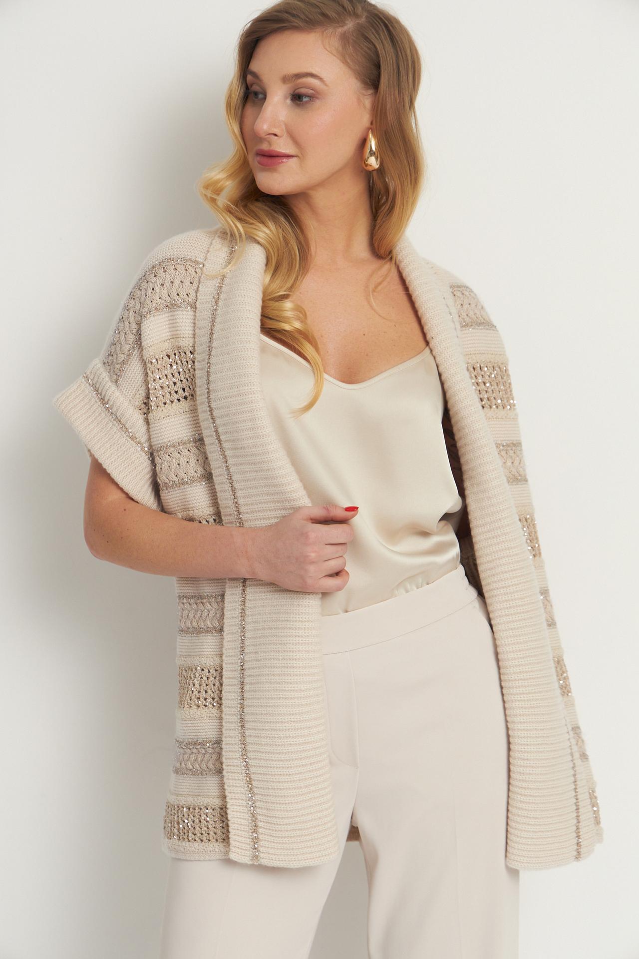- Изысканный дизайн: Бежевый жакет с ажурной вязкой и деликатными блестящими вставками создает элегантный и современный образ, легко комбинируемый с различными элементами гардероба.