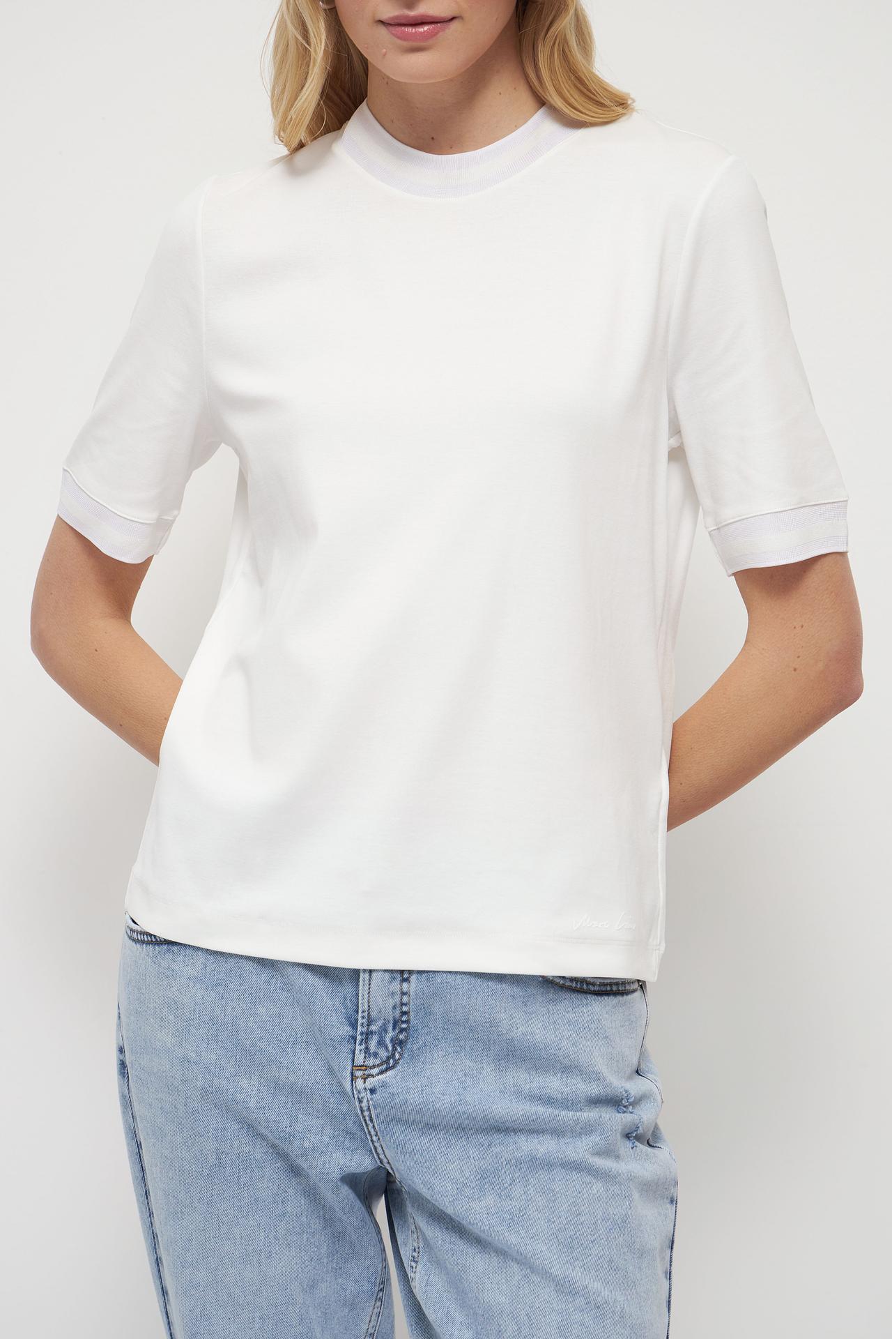 Элегантная белая футболка от Marc Cain – воплощение стиля и комфорта. Изготовленная из высококачественного хлопка с добавлением эластана, она идеально садится по фигуре, обеспечивая свободу движений. Эта футболка станет незаменимой частью вашего гардероба, подходящей для создания разнообразных образов.