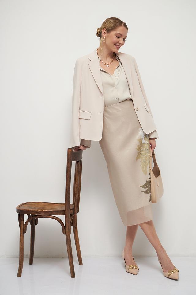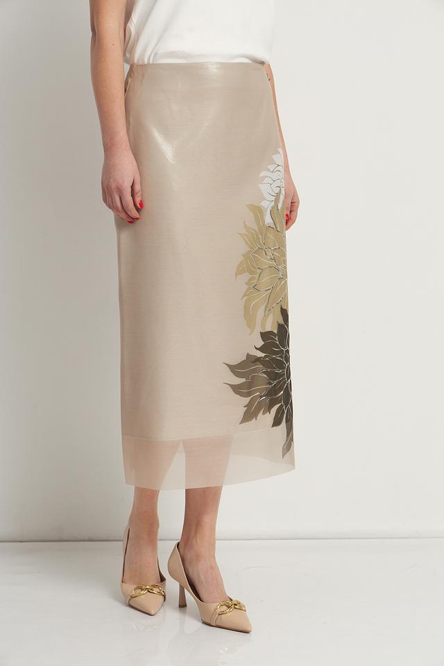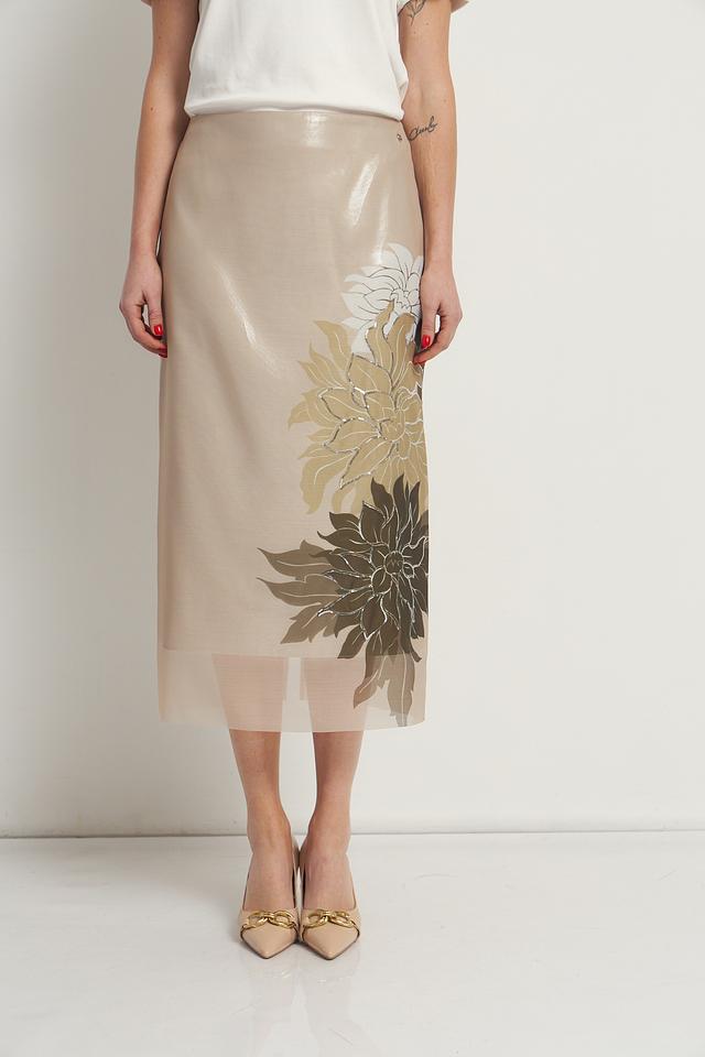 Юбка Marc Cain бежевого цвета с цветочным принтом. Изготовлена из 100% полиэстера, отличается элегантным дизайном и длиной миди. Состав: полиэстер 100%