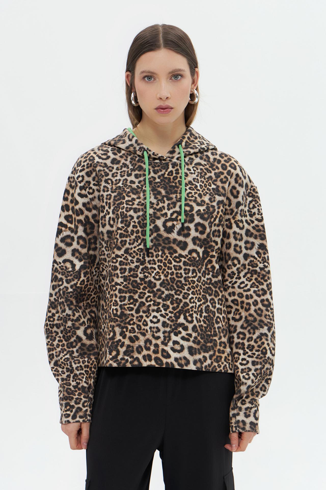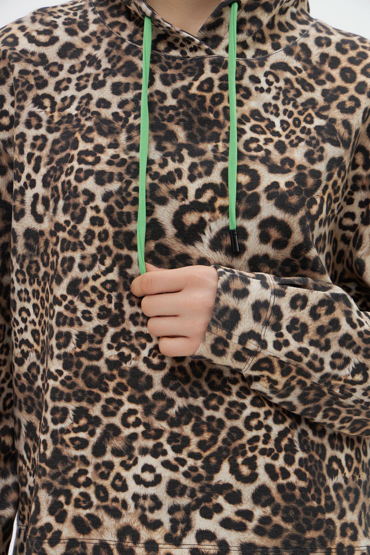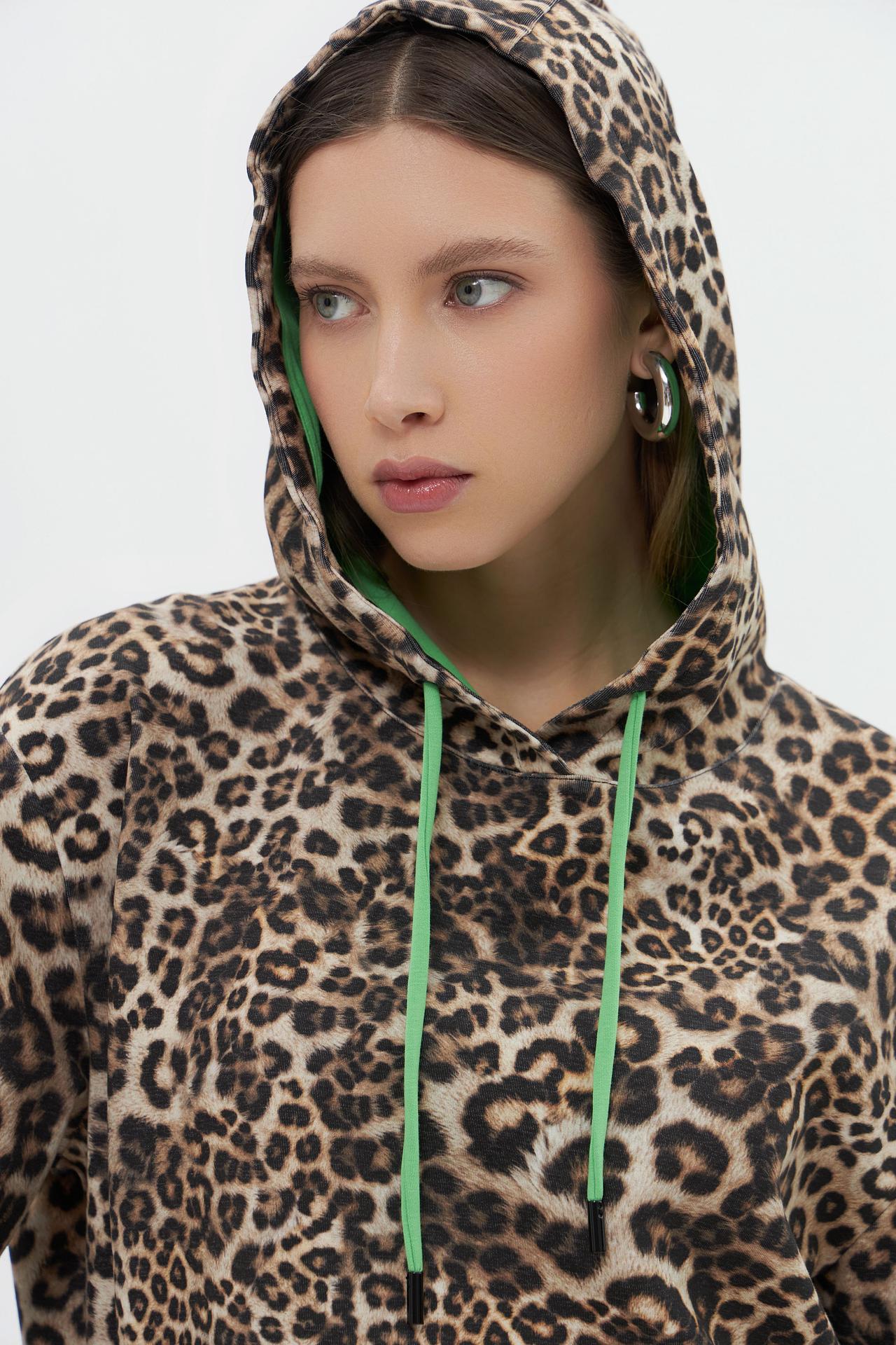 - Эксклюзивный дизайн. Леопардовый принт — это классика, которая всегда остается в тренде, придавая образу смелости и элегантности. Сочетание коричневых, черных и бежевых оттенков с яркими зелеными акцентами делает худи уникальным.