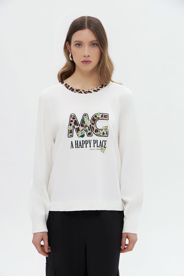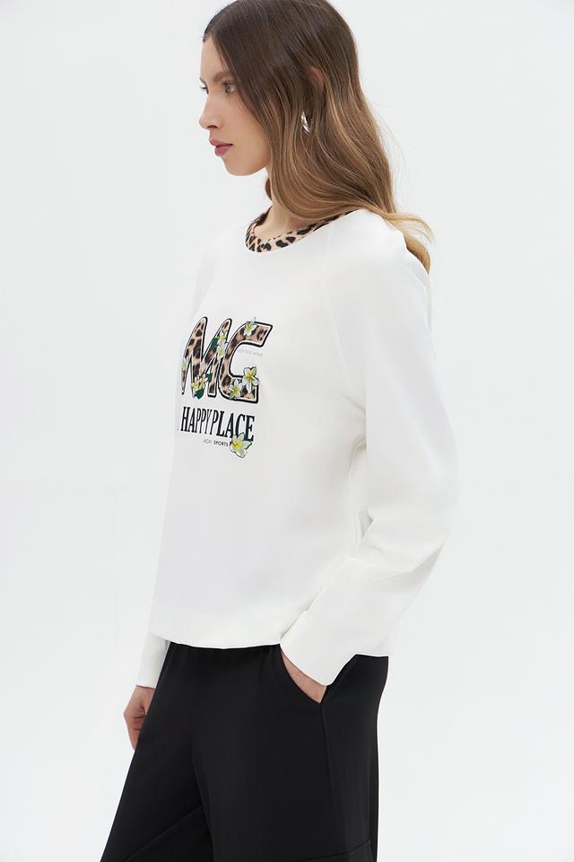 Белый пуловер Marc Cain с ярким принтом "MC A HAPPY PLACE" станет стильным дополнением к вашему гардеробу. Изготовлен из мягкого хлопка с добавлением эластана для комфорта и отличной посадки. Состав: хлопок 95%, эластан 5%