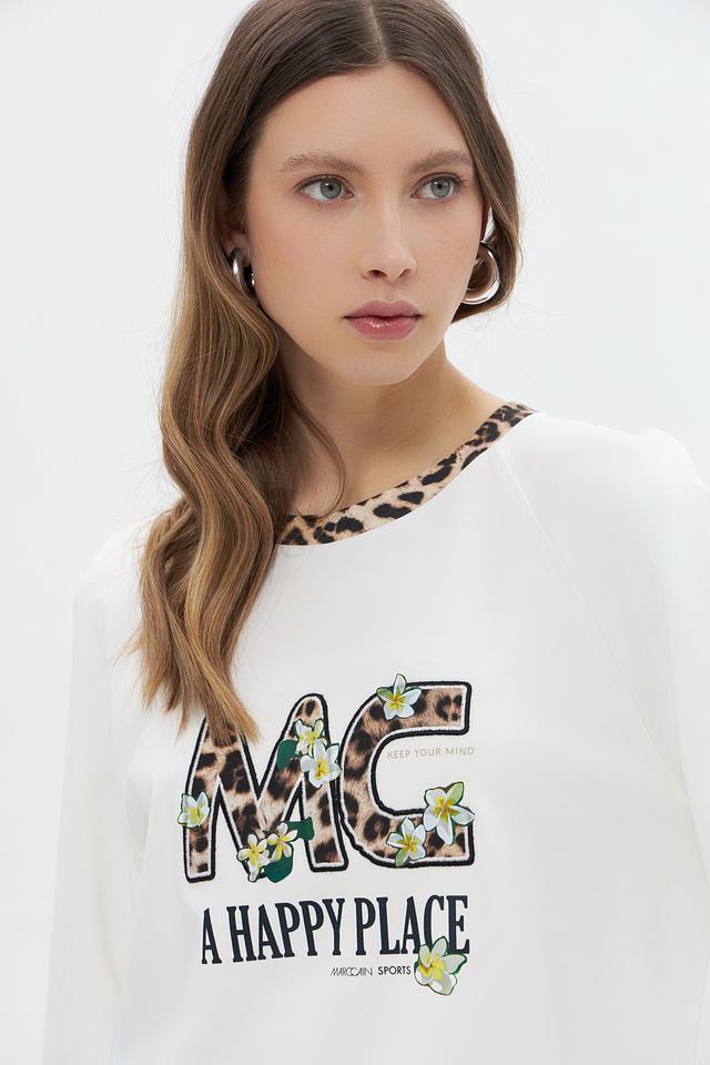 Этот стильный пуловер от Marc Cain выполнен в белом цвете и украшен эффектным принтом с логотипом бренда "MC A HAPPY PLACE". Модель имеет классический крой с длинными рукавами и круглым вырезом горловины.