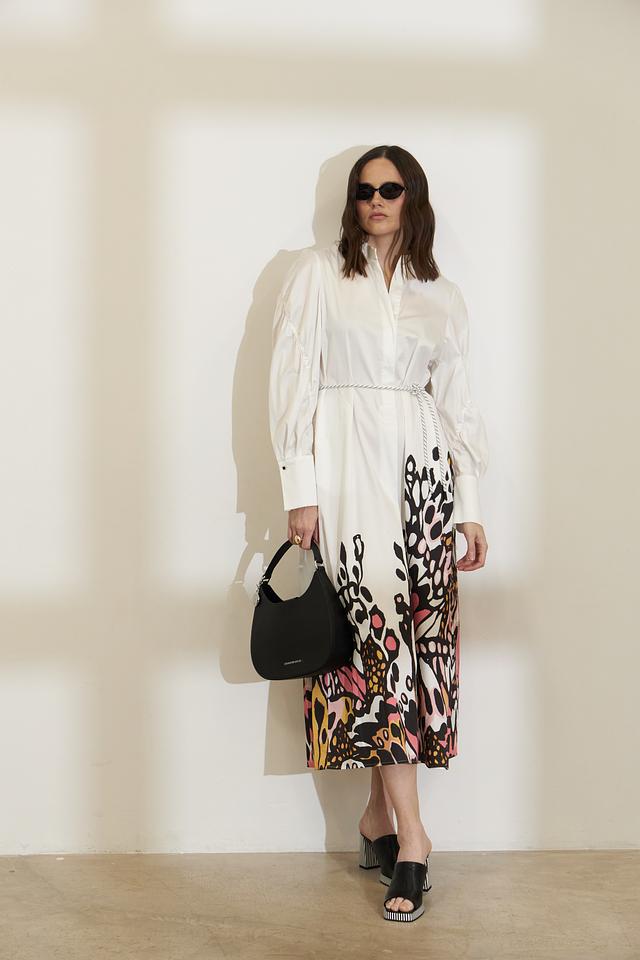Верх платья выполнен в белом цвете и имеет рубашечный крой с длинными рукавами и воротником. Юбка платья украшена оригинальным цветочным принтом, выполненным в ярких оттенках розового, оранжевого и черного. Платье имеет свободный силуэт, который подчеркивает женственность и элегантность.