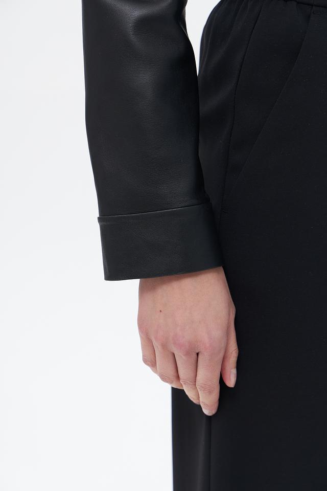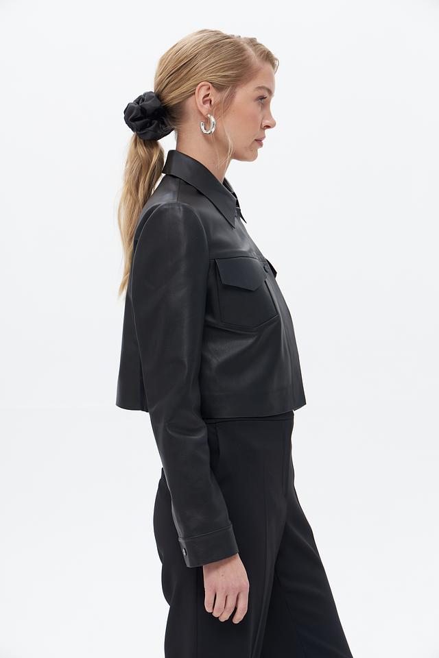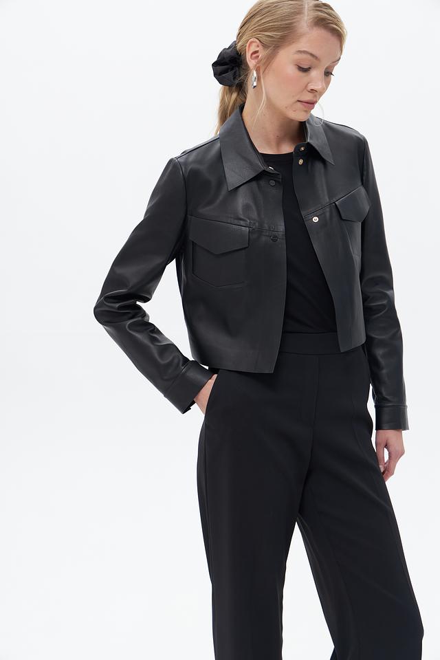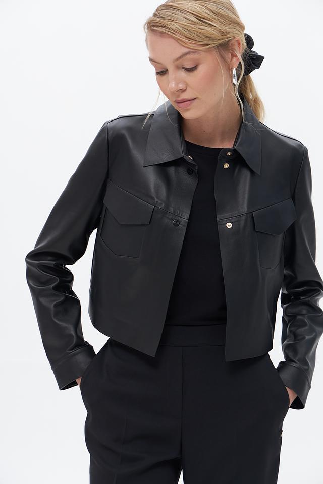 Чёрный кожаный жакет Marc Cain – стильная и современная модель укороченного кроя. Жакет имеет рубашечный силуэт с лацканами и застёжкой на пуговицы, а также накладные карманы на груди. Состав: кожа 100%