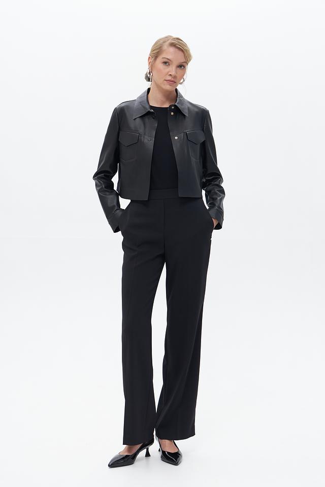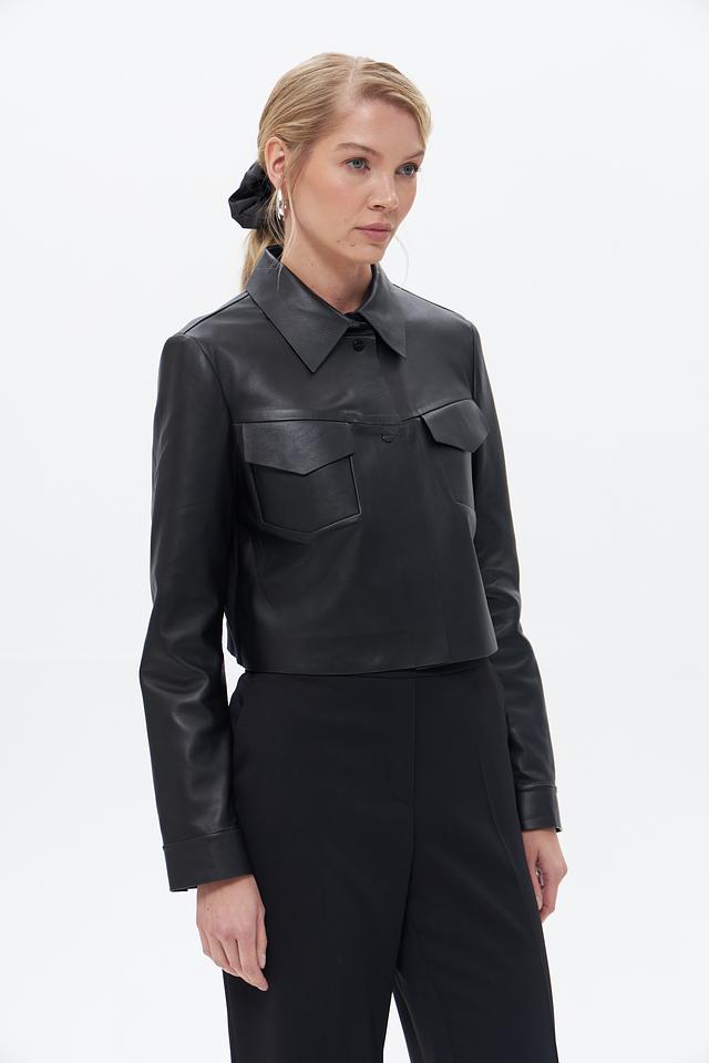 Жакет имеет укороченный крой и рубашечный силуэт с лацканами, что придает ему современный и модный вид. Застёжка на пуговицы позволяет регулировать степень прилегания, а накладные карманы на груди добавляют функциональности и стиля.