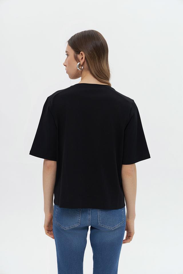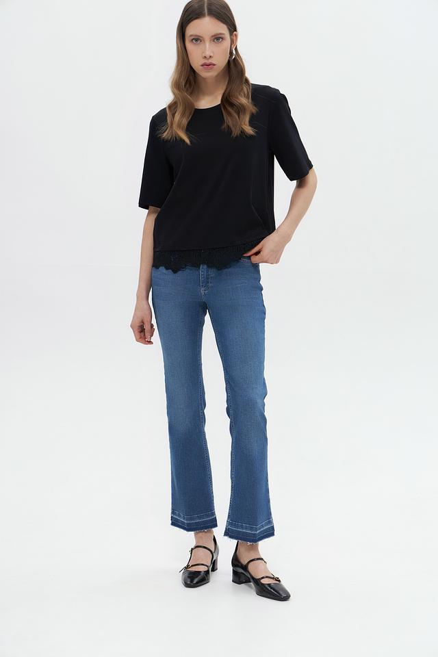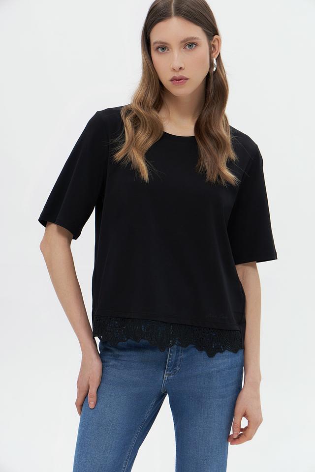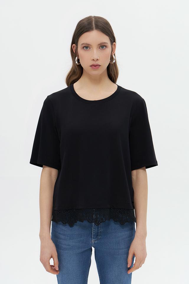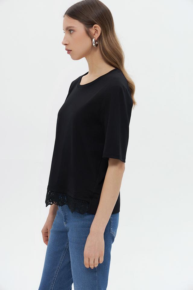 Основной цвет футболки – чёрный, что делает её универсальной и легко сочетаемой с другими элементами одежды. Особый акцент в дизайне – кружевная отделка по нижнему краю, придающая изделию женственность и изысканность.