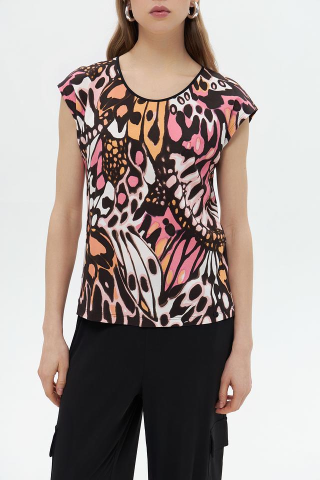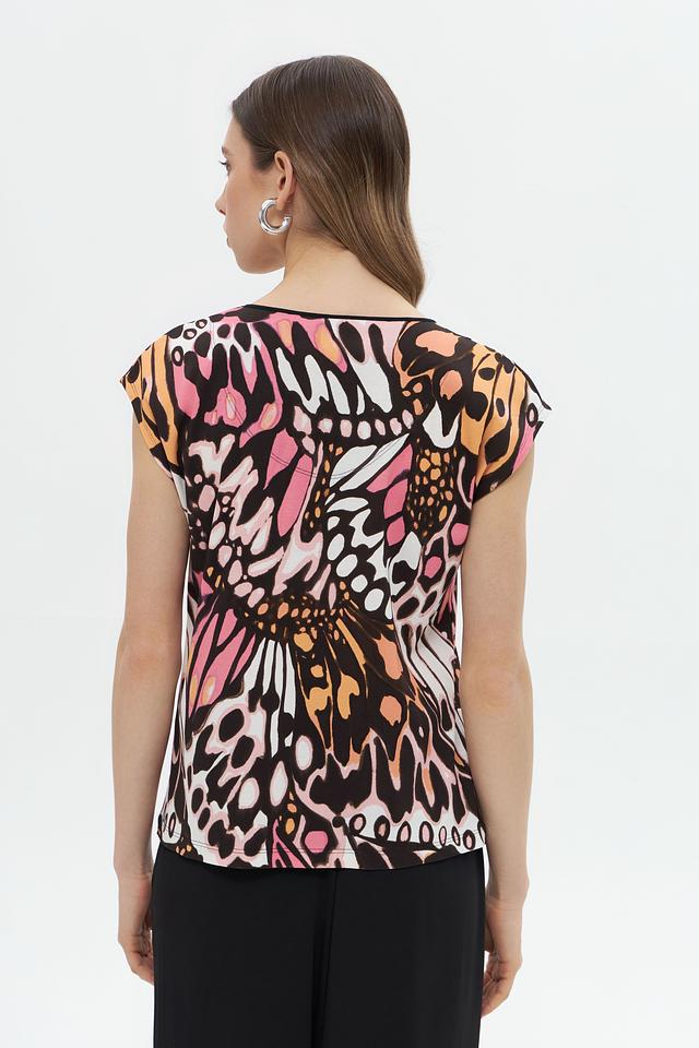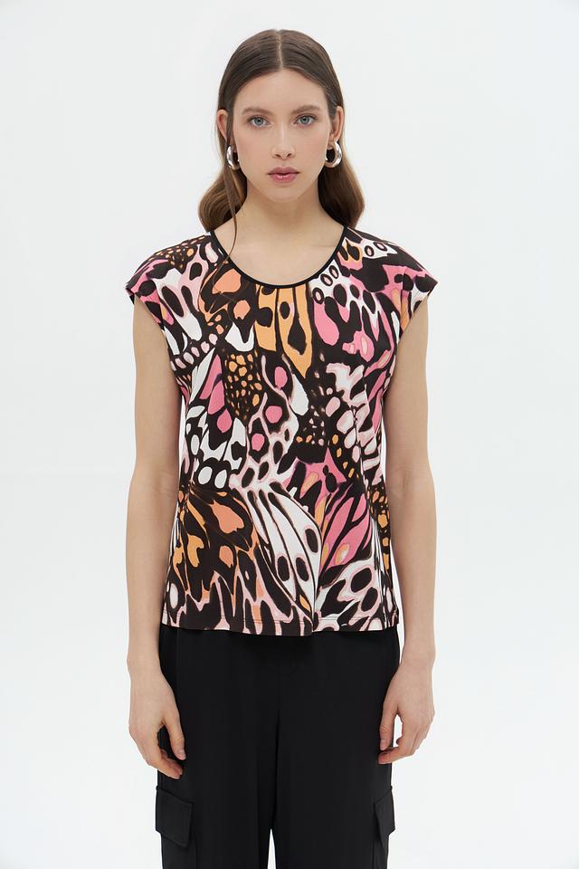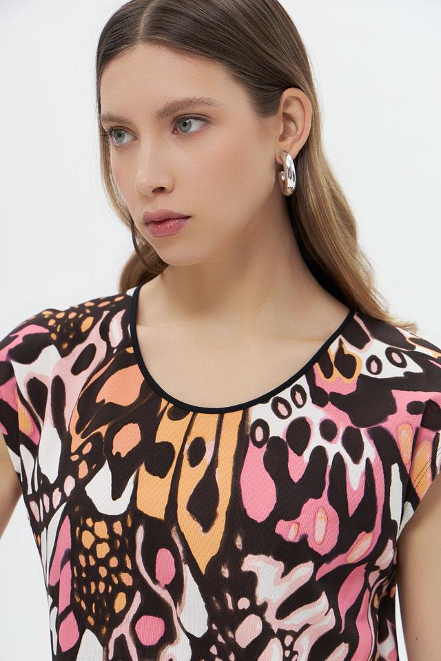 Топ имеет короткий рукав и округлый вырез горловины, что делает его универсальным для различных случаев. Главной особенностью модели является эффектный цветочный принт, выполненный в насыщенных оттенках розового, оранжевого, коричневого и белого.