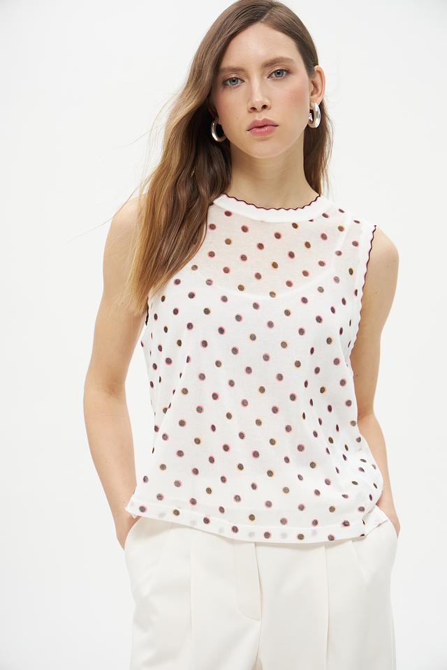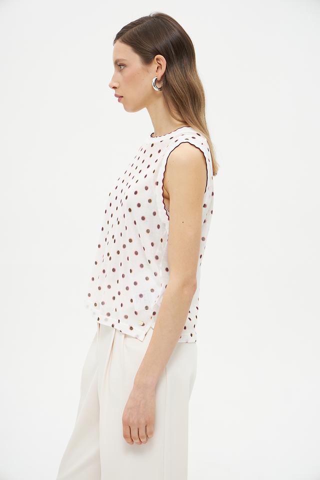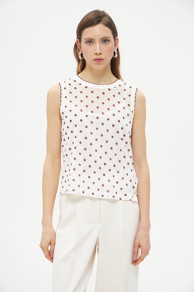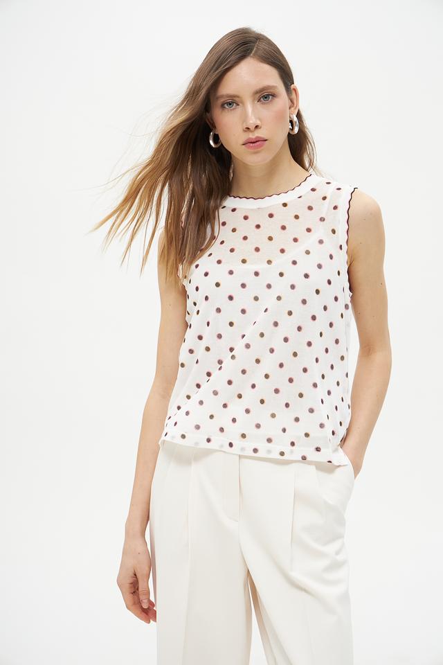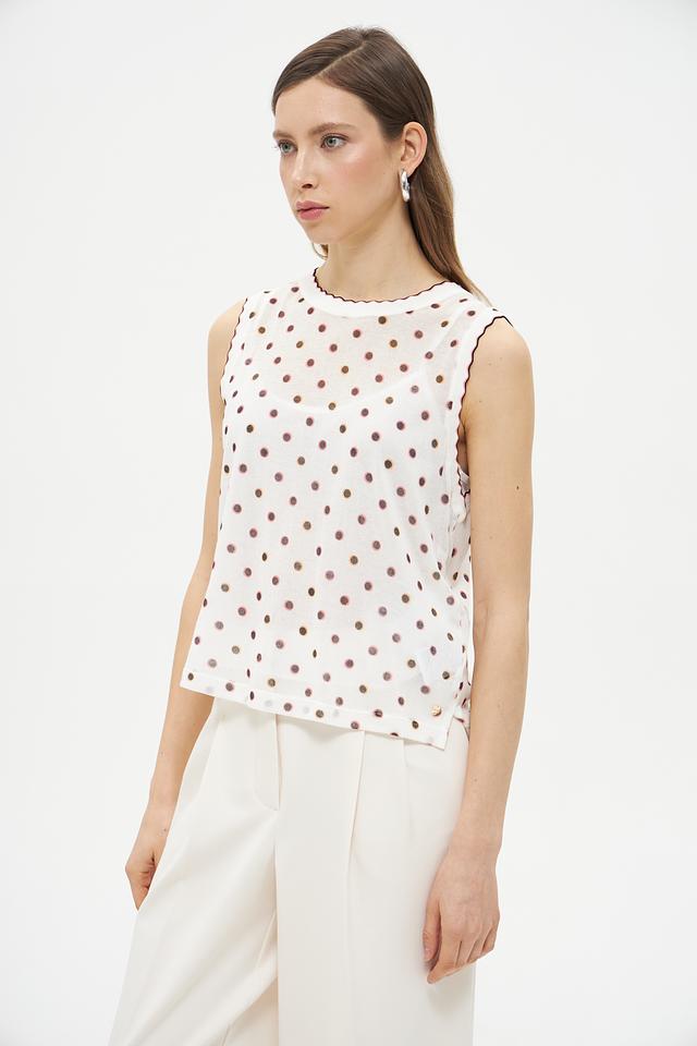 Этот топ от Marc Cain Collections станет прекрасным дополнением к вашему летнему гардеробу. Выполненный в белом цвете с мелким коричневым горошком, он привносит нотку романтики и свежести в любой образ.
