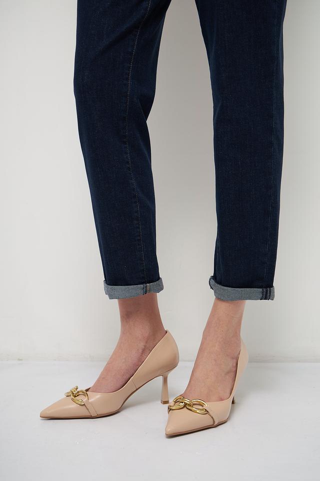 Застежка на молнию и пуговицу, пять карманов – два спереди и три сзади. На заднем кармане расположен небольшой лейбл с логотипом бренда. Джинсы имеют слегка потёртый эффект, что придает им более непринужденный и современный вид. Подвернутые штанины добавляют образу лёгкости и стиля.