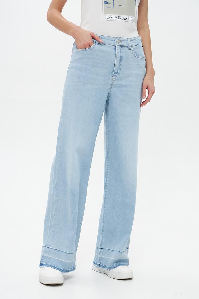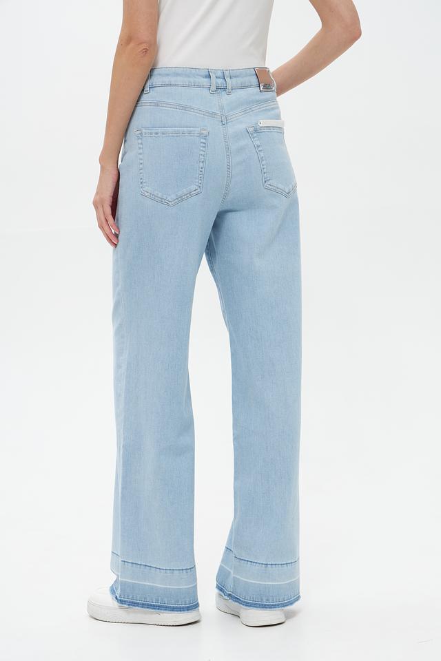 Светло-голубые джинсы Marc Cain свободного кроя с заниженной талией. Модель выполнена из качественного хлопка с добавлением эластана для комфорта и отличной посадки. Оригинальный дизайн дополнен контрастной отделкой по низу. Состав: хлопок 92%, эластомультиэстер 6%, эластан 2%