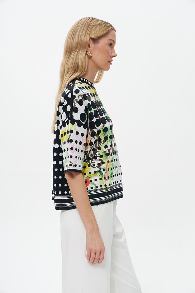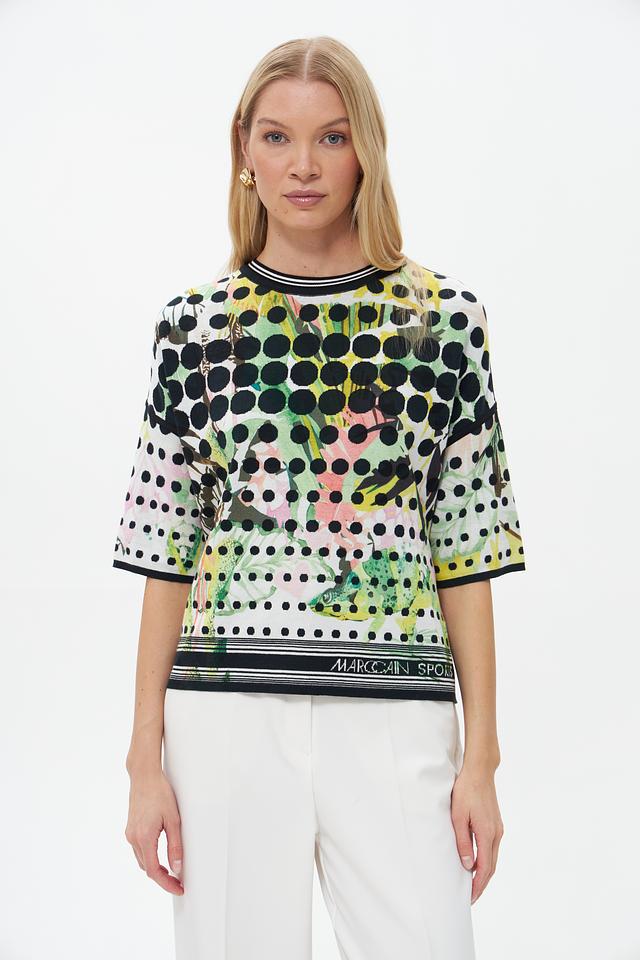Женский пуловер Marc Cain с ярким цветочным принтом и узором в горошек. Модель выполнена из 100% хлопка, что обеспечивает комфорт и приятные тактильные ощущения. Идеальный выбор для создания стильного и лёгкого образа. Состав: хлопок 100%