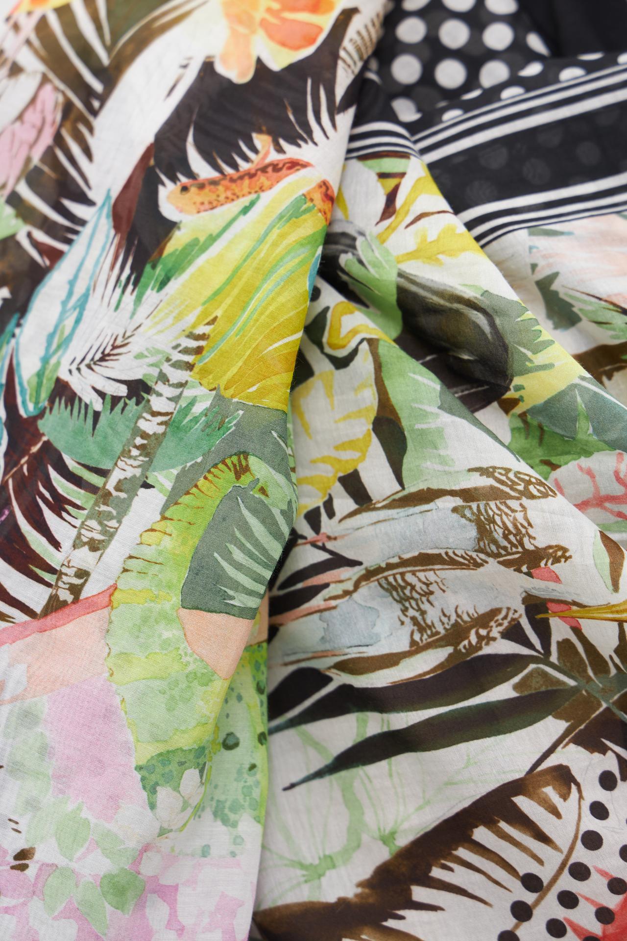 Элегантный и стильный шарф от Marc Cain, выполненный из премиальной смесовой ткани. Сочетание хлопка и шелка (72% хлопок, 28% шелк) обеспечивает мягкость, легкость и приятные тактильные ощущения. Шарф с красочным тропическим принтом и контрастной отделкой в горошек станет ярким акцентом в вашем образе.
