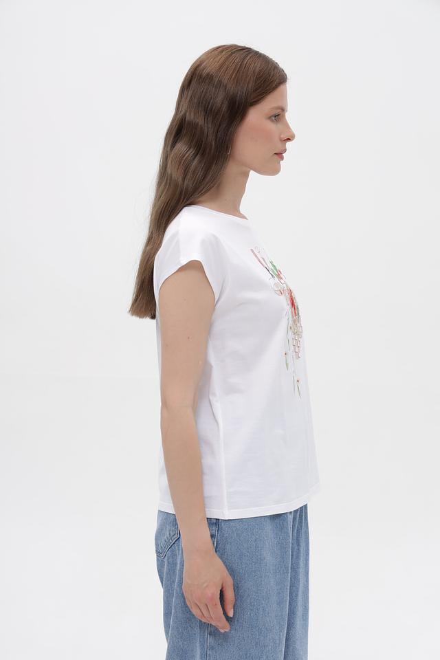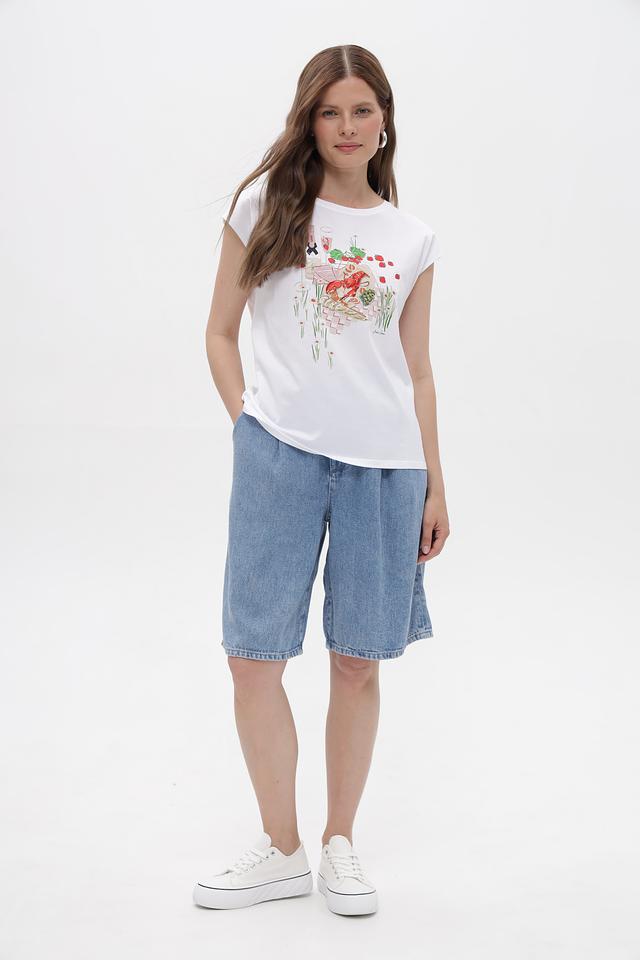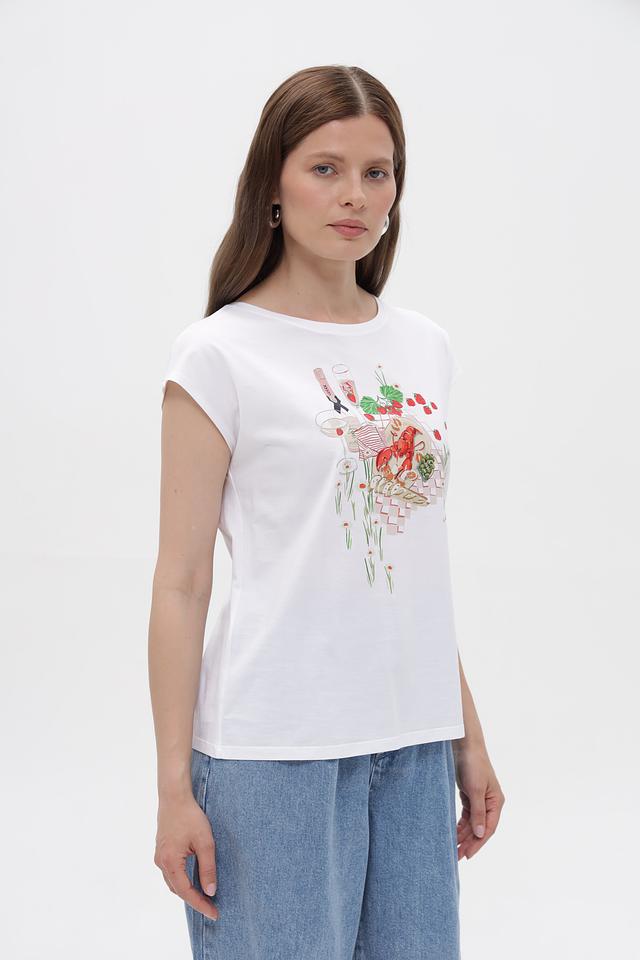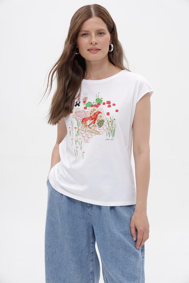 Белая футболка Marc Cain из 100% хлопка с ярким принтом в виде натюрморта. Модель имеет удобный крой и короткие рукава с манжетами. Идеальна для создания летних образов. Состав: хлопок 100%