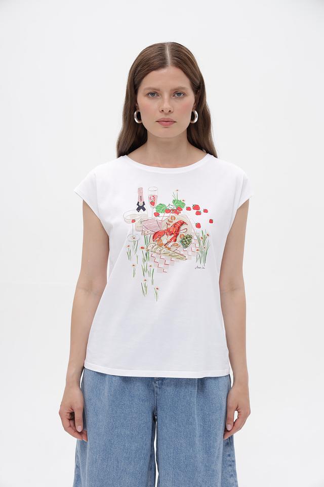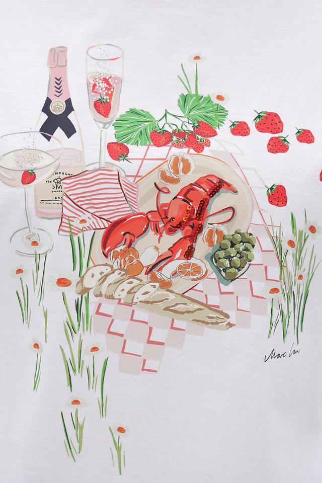 Особенностью модели является яркий и детализированный принт на передней части, изображающий натюрморт с морепродуктами, ягодами и напитками. Футболка имеет классический крой с короткими рукавами, отделанными манжетами.
