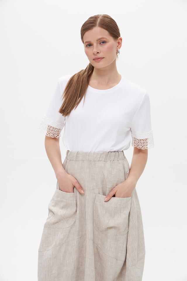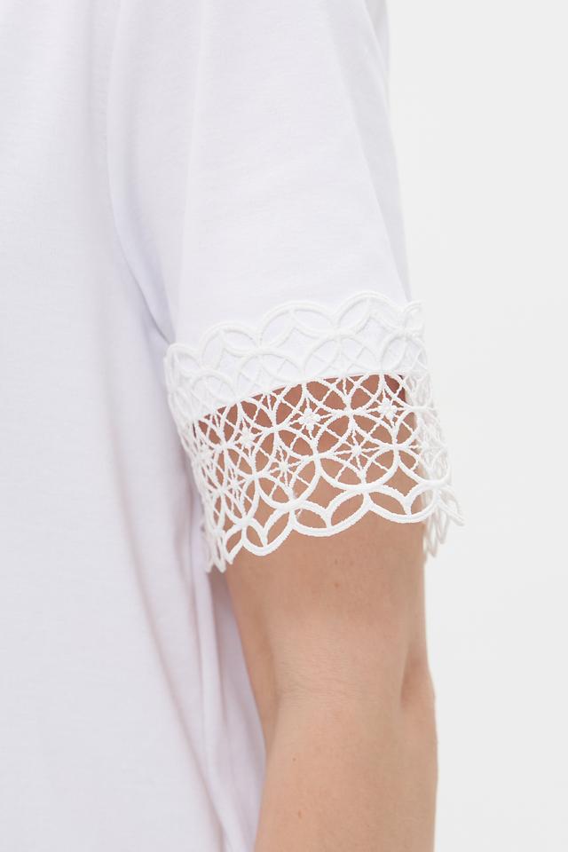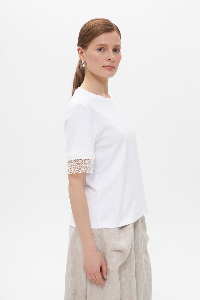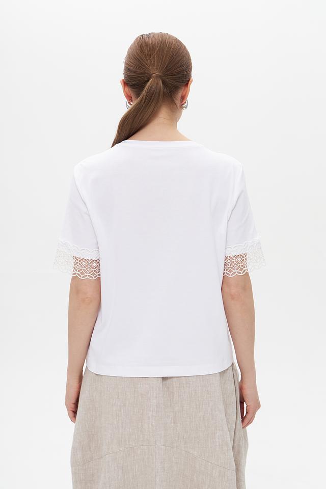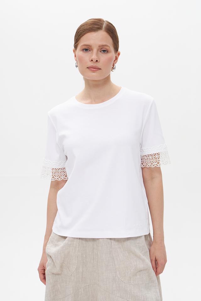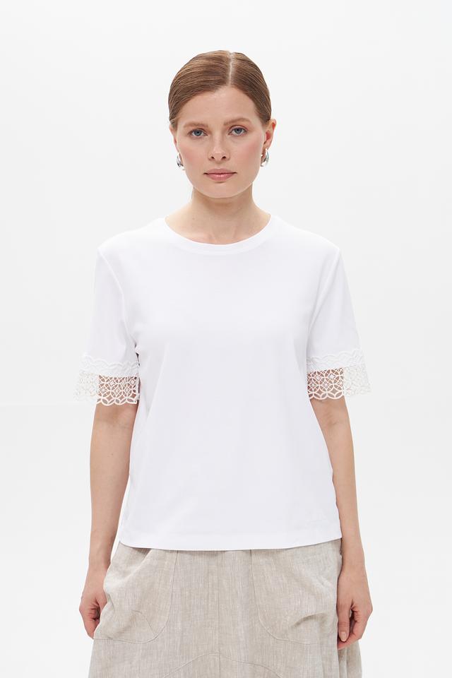 Особенностью модели является короткий рукав, отделанный изящным кружевом, что придает ей женственности и утонченности. Классический круглый вырез горловины и прямой крой делают футболку универсальной и подходящей для различных образов.