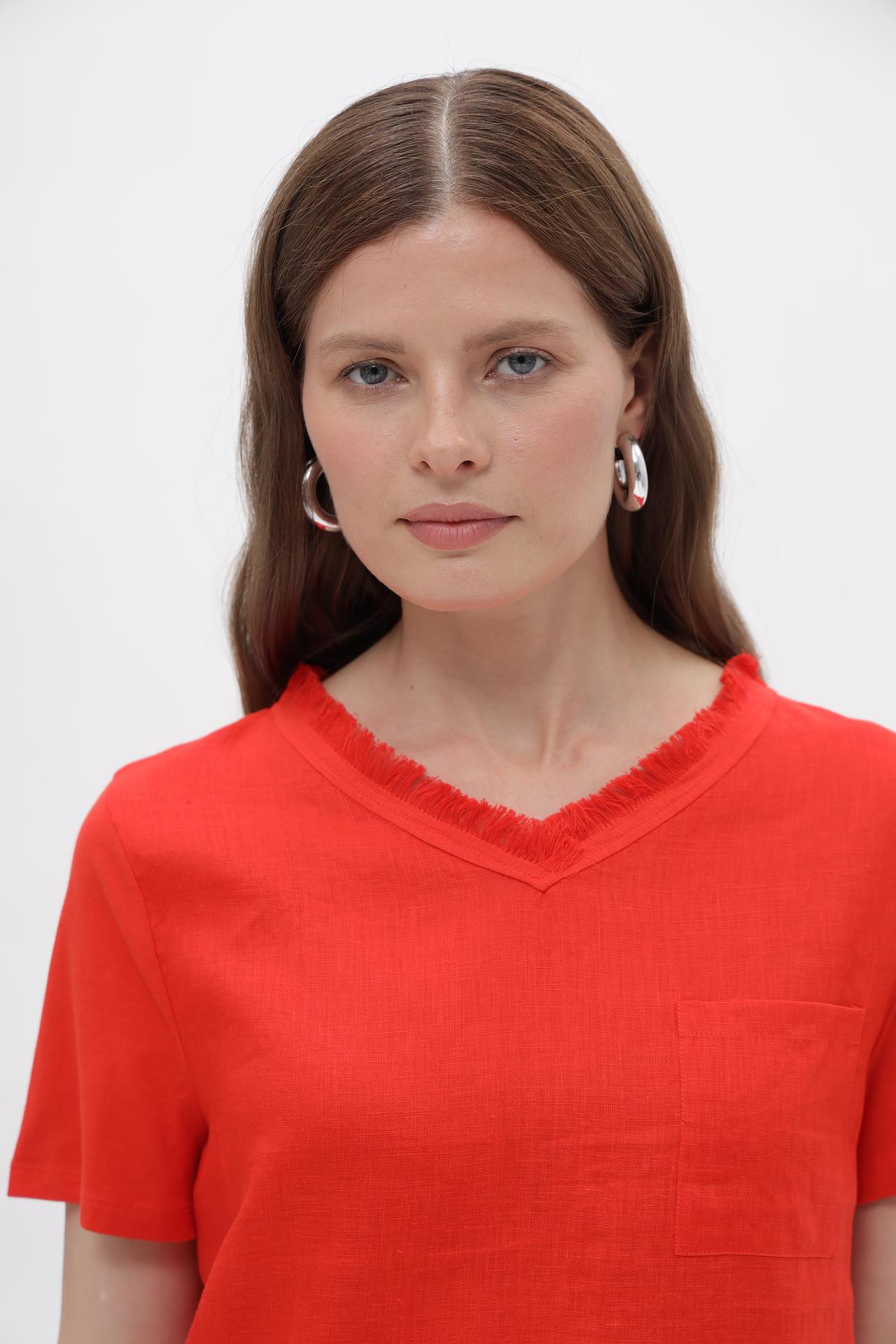 - Оригинальный дизайн: Модель украшена эффектной бахромой по краю V-образного выреза и по низу изделия, что придает ей непринужденный и современный вид. На груди расположен аккуратный накладной карман, добавляющий функциональности.