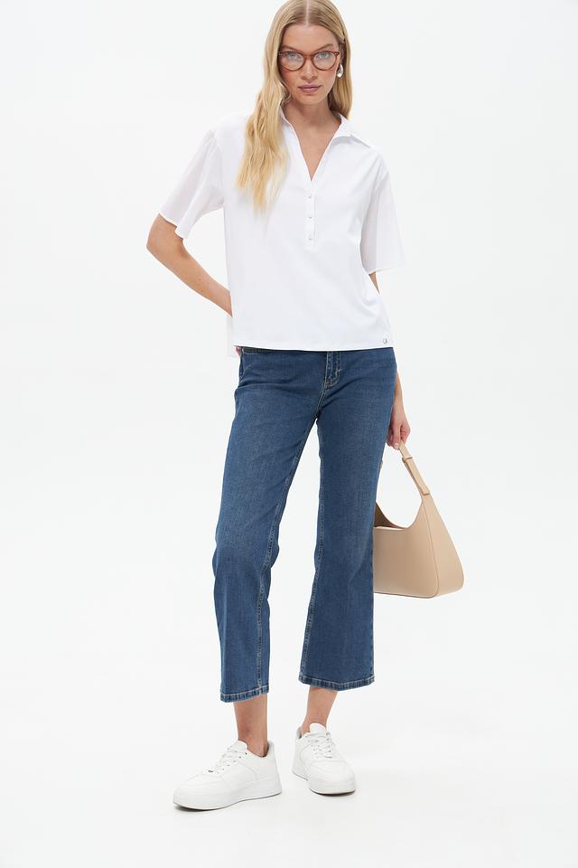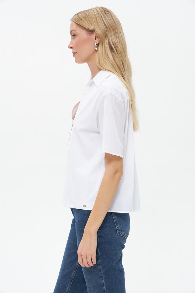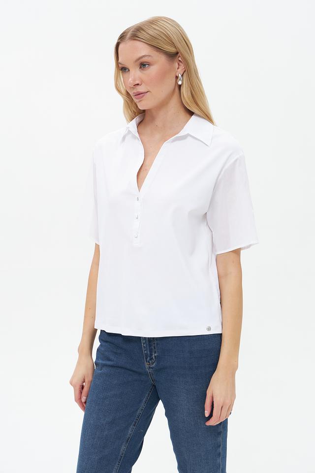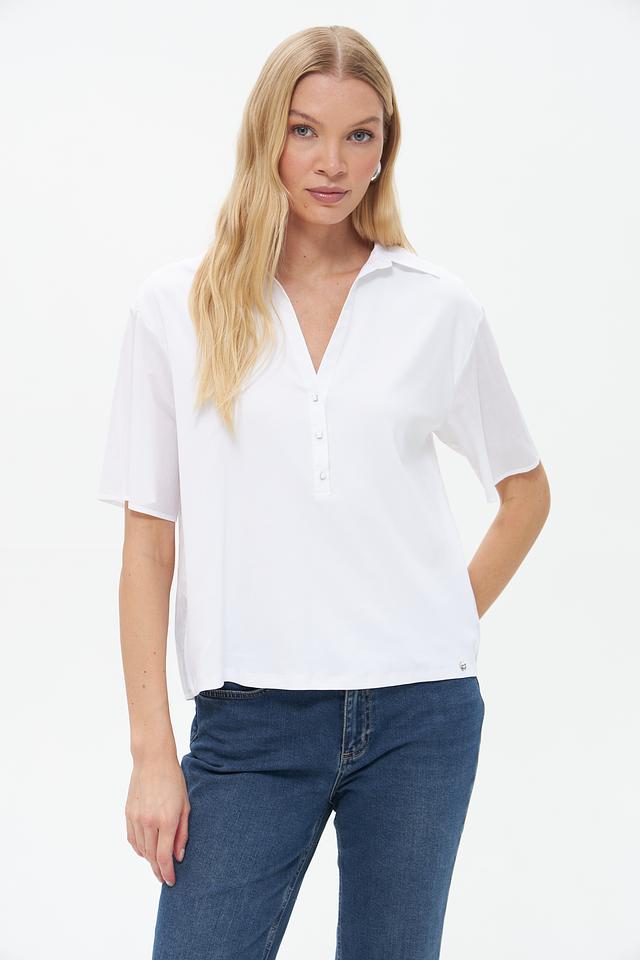 Модель имеет V-образный вырез и короткие рукава, что делает её идеальным выбором для тёплой погоды. Застёжка на пуговицы добавляет функциональности и позволяет регулировать степень открытости выреза.