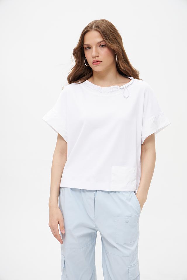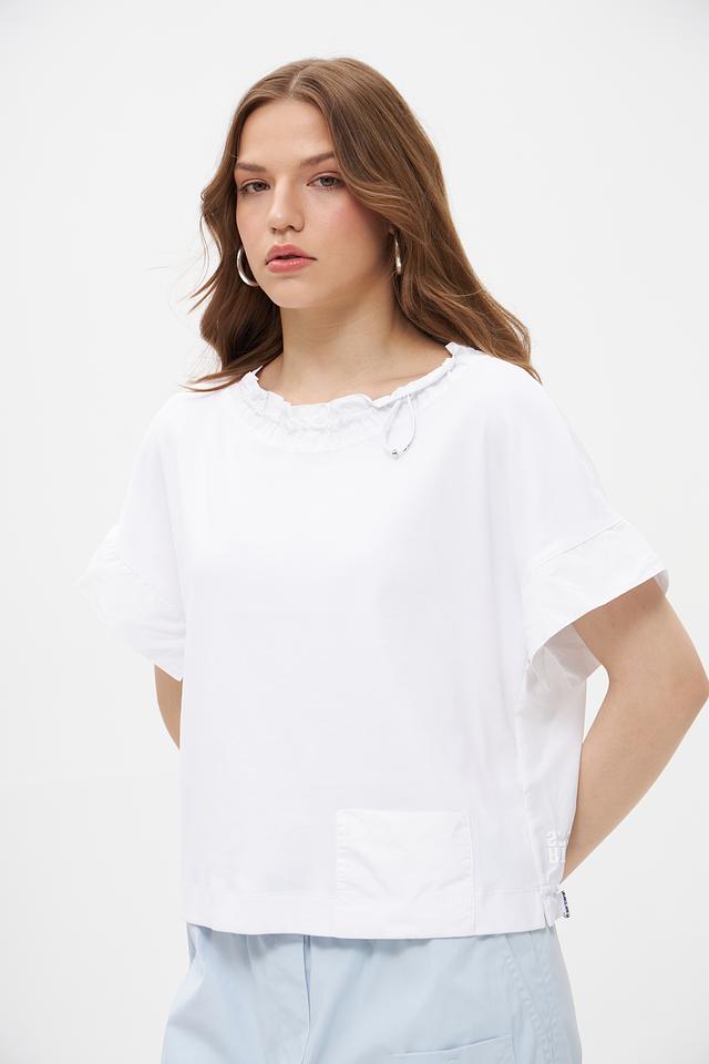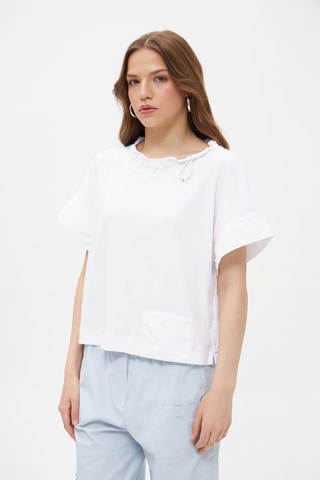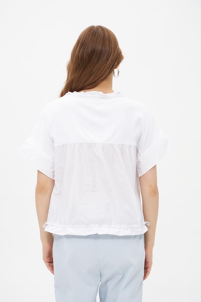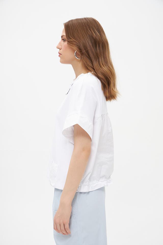 Белая блузка от Marc Cain из хлопка с добавлением эластана, украшенная рюшами и завязками. Модель свободного кроя с короткими рукавами, идеально подойдет для создания легкого и стильного образа. Состав: хлопок 94%, эластан 6%
