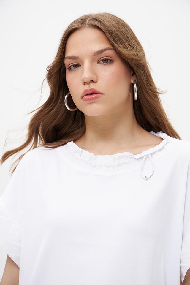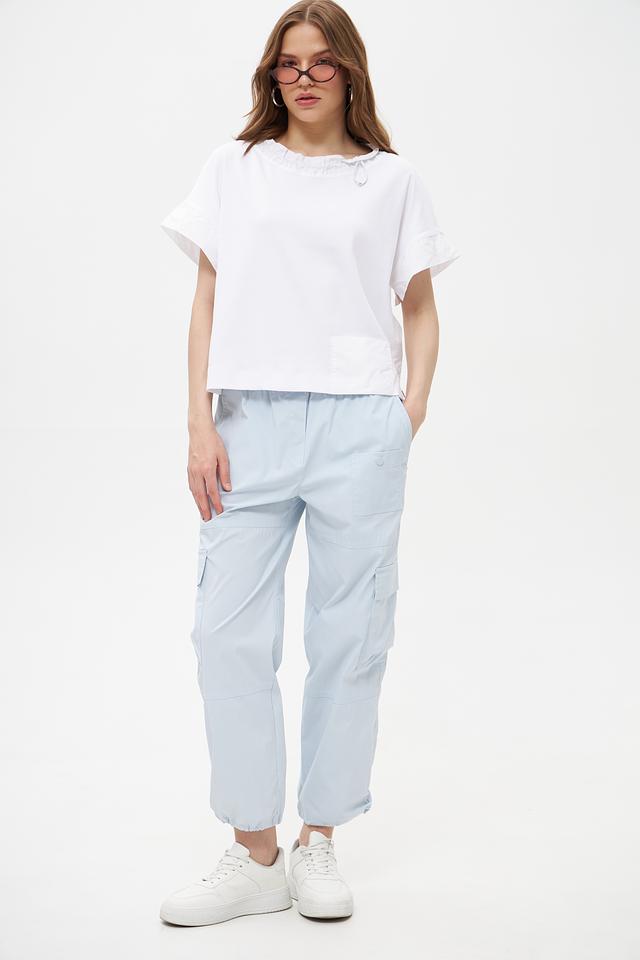Блузка имеет свободный крой, который не сковывает движения и позволяет создать расслабленный образ. Особый акцент сделан на детали: блузка украшена рюшами по горловине и имеет завязки, которые добавляют изысканности.