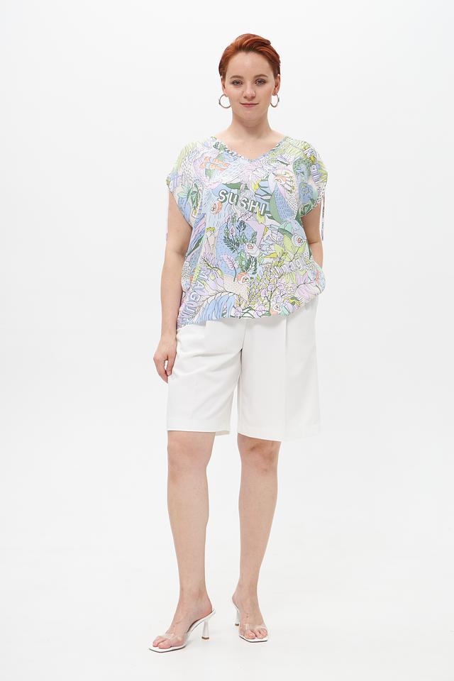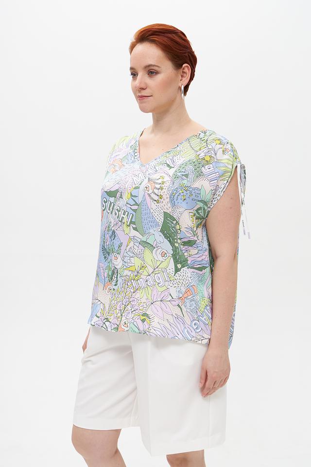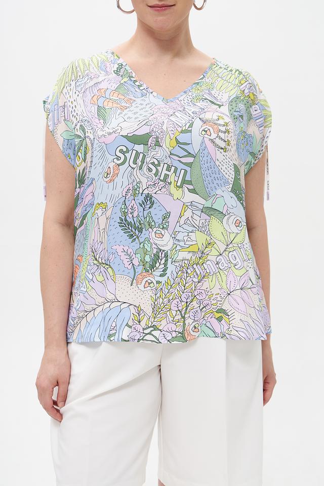 Блузка имеет свободный крой, V-образный вырез и открытые плечи, что придает ей непринужденный и стильный вид. Оригинальный принт с изображением суши, японских мотивов и надписями делает эту модель уникальной и запоминающейся.
