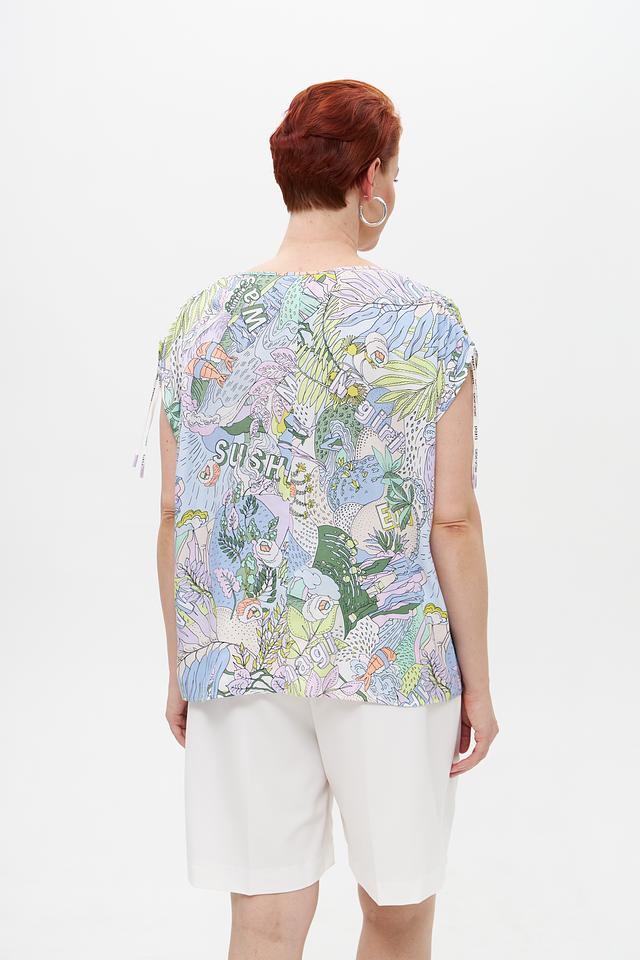 Блузка Marc Cain голубого цвета с оригинальным принтом в виде суши и японских мотивов. Изготовлена из легкой и приятной к телу вискозы, идеально подходит для создания летних образов. Состав: вискоза 100%