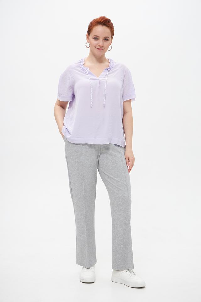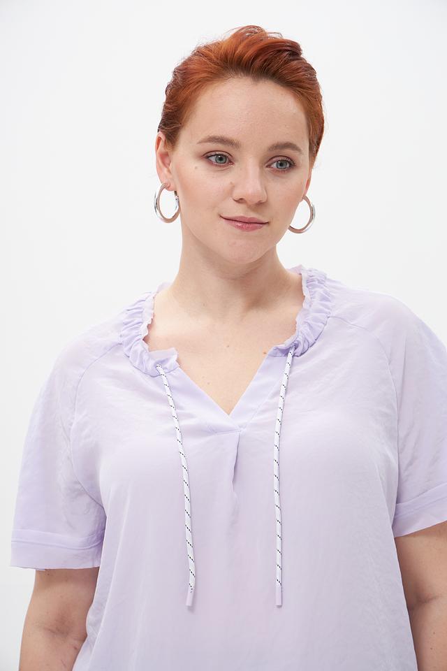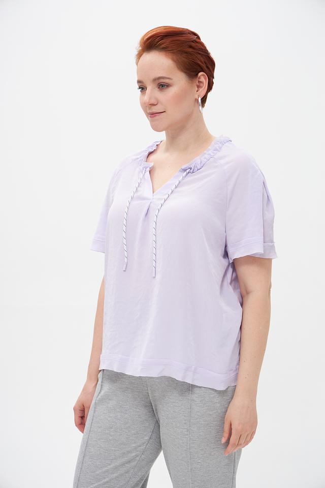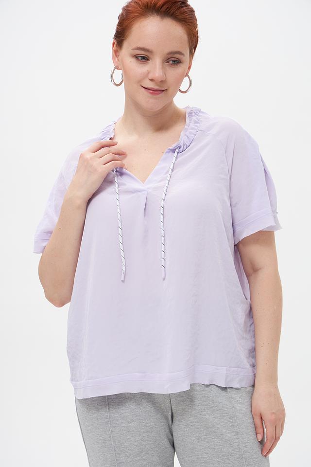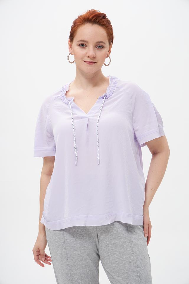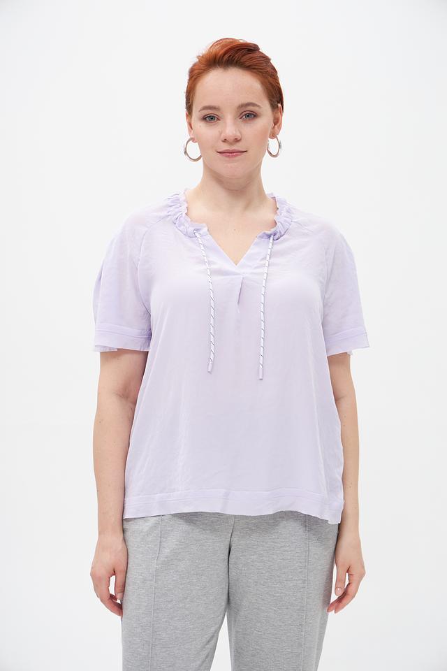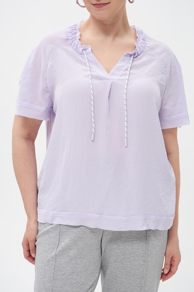 Лавандовая блузка Marc Cain из смесового материала с короткими рукавами и декоративными завязками на V-образном вырезе. Состав: полиэстер и переработанный полиэстер. Состав: полиэстер 59%, переработ.полиэстер 41%