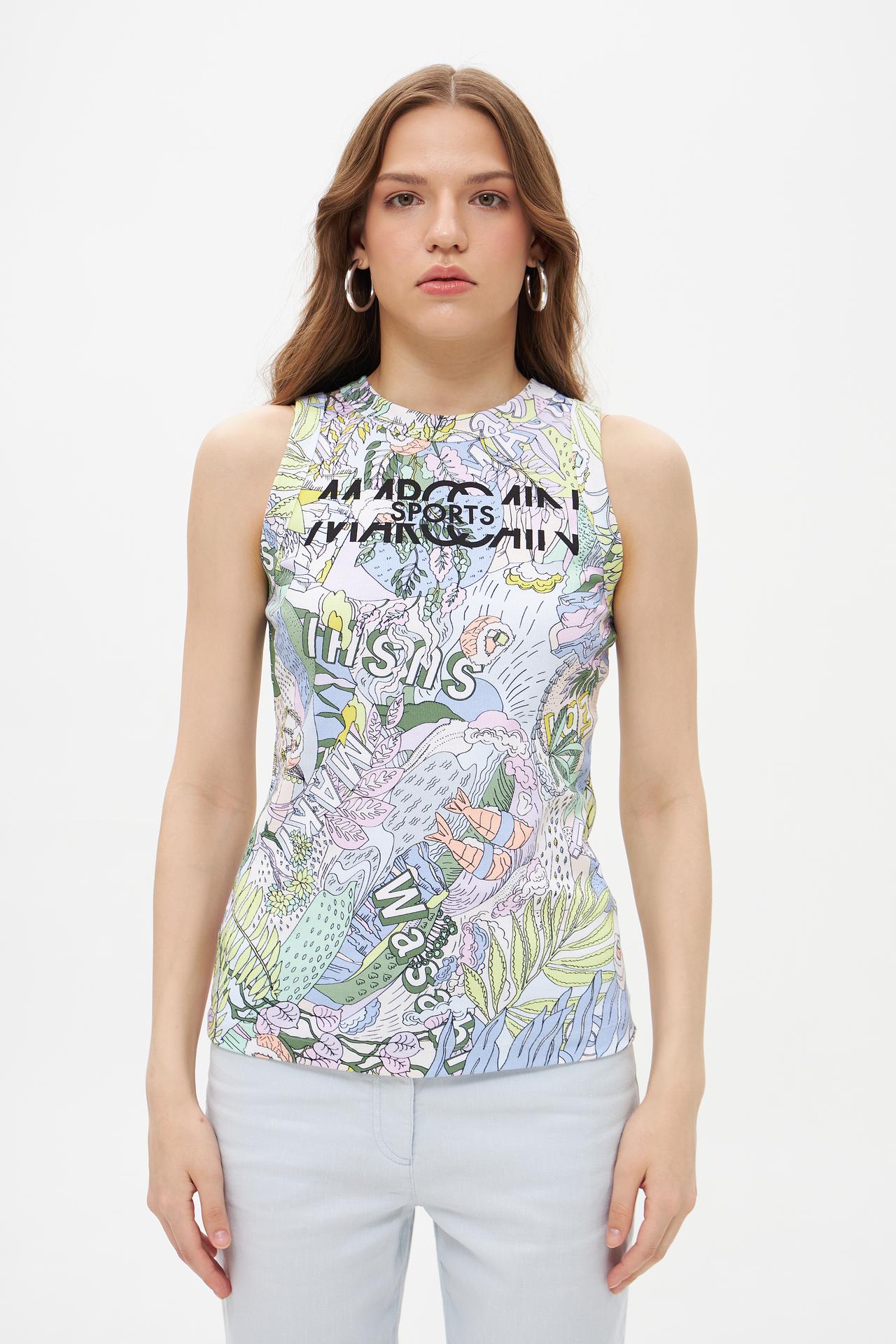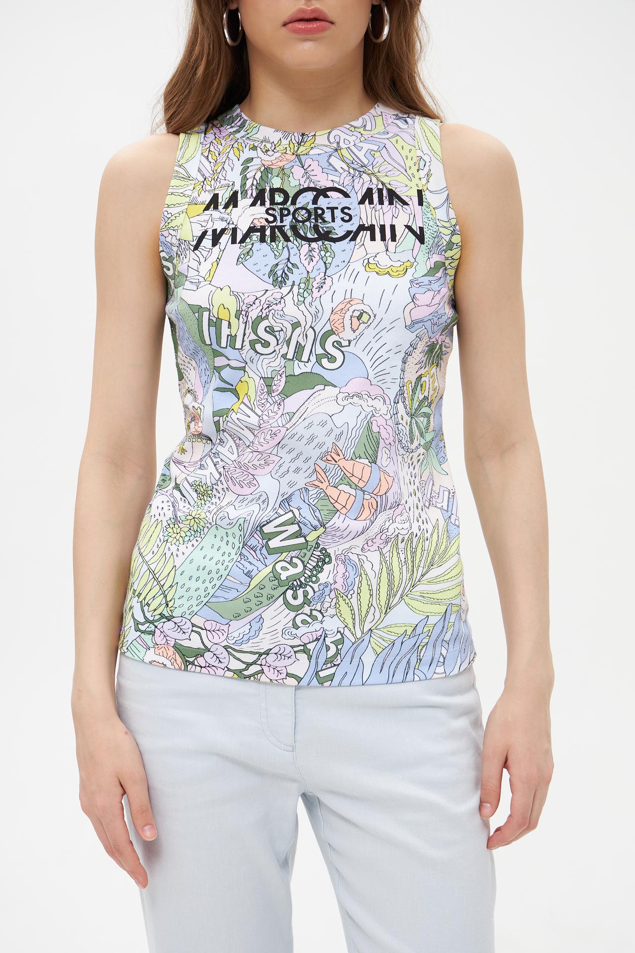 Яркий и стильный топ от Marc Cain, выполненный из приятного к телу материала, станет прекрасным дополнением вашего гардероба. Изготовлен из высококачественного хлопка с добавлением эластана, что обеспечивает комфорт и отличную посадку по фигуре. Оригинальный принт делает эту модель особенной и запоминающейся. Этот топ идеально подходит для создания модных и непринужденных образов в стиле casual и sport chic.