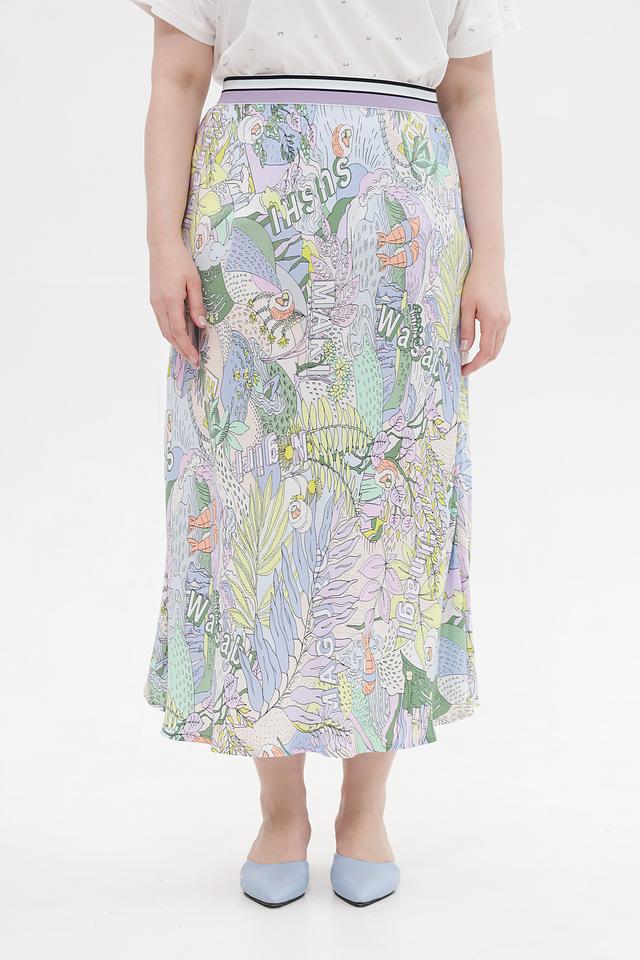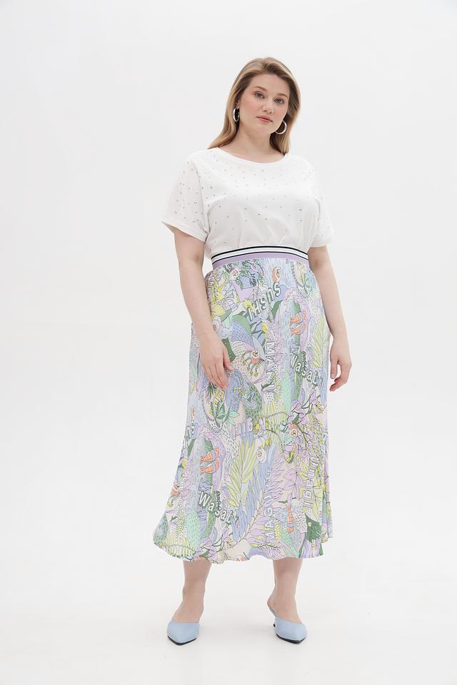 Основным акцентом юбки является яркий и оригинальный принт с изображением растительных мотивов и надписей. Эластичный пояс обеспечивает надежную посадку по фигуре, подчеркивая талию.