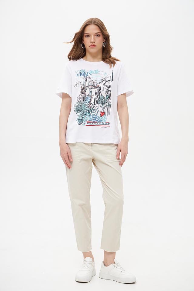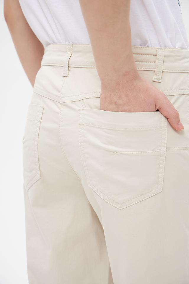 Брюки изготовлены из высококачественного хлопка с добавлением эластана, что обеспечивает приятные тактильные ощущения, хорошую посадку по фигуре и лёгкость в уходе. Прямой крой и укороченная длина делают их универсальными для создания различных образов.
