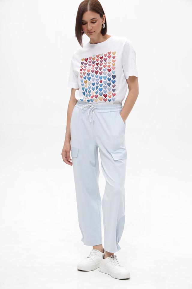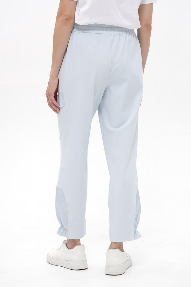 Брюки имеют удобный эластичный пояс с регулируемым шнурком, обеспечивающим комфортную посадку. Функциональные карманы позволяют удобно хранить необходимые мелочи. По низу брюк выполнены небольшие сборки, придающие образу лёгкость и динамичность.