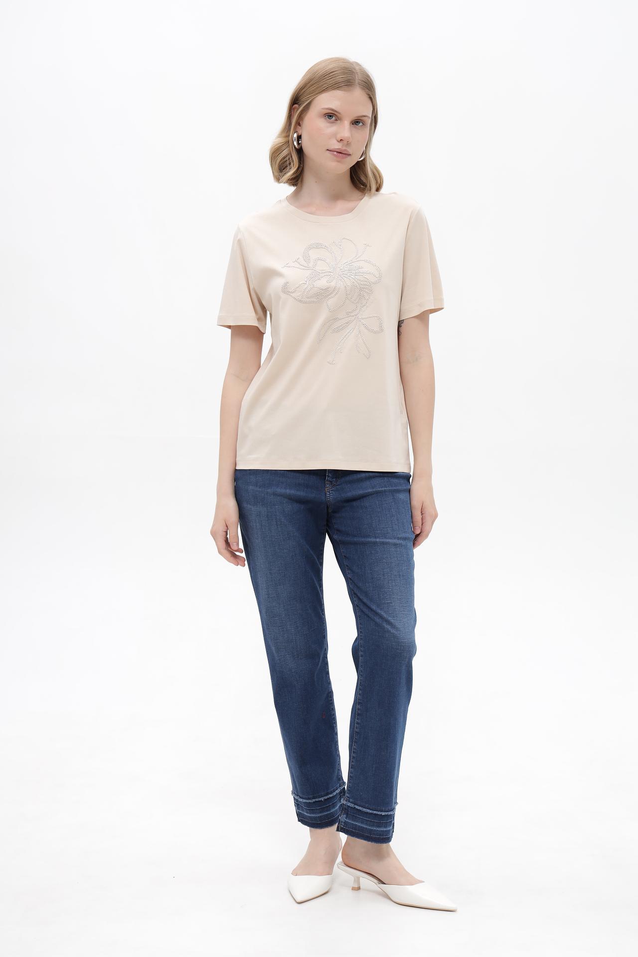 Классический крой футболки делает её универсальной и легко сочетаемой с различными элементами гардероба. Футболка представлена в элегантном бежевом цвете, который подчеркнёт Вашу женственность и добавит образу изысканности.
