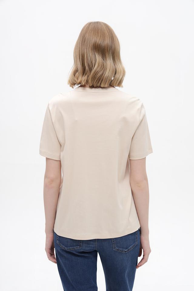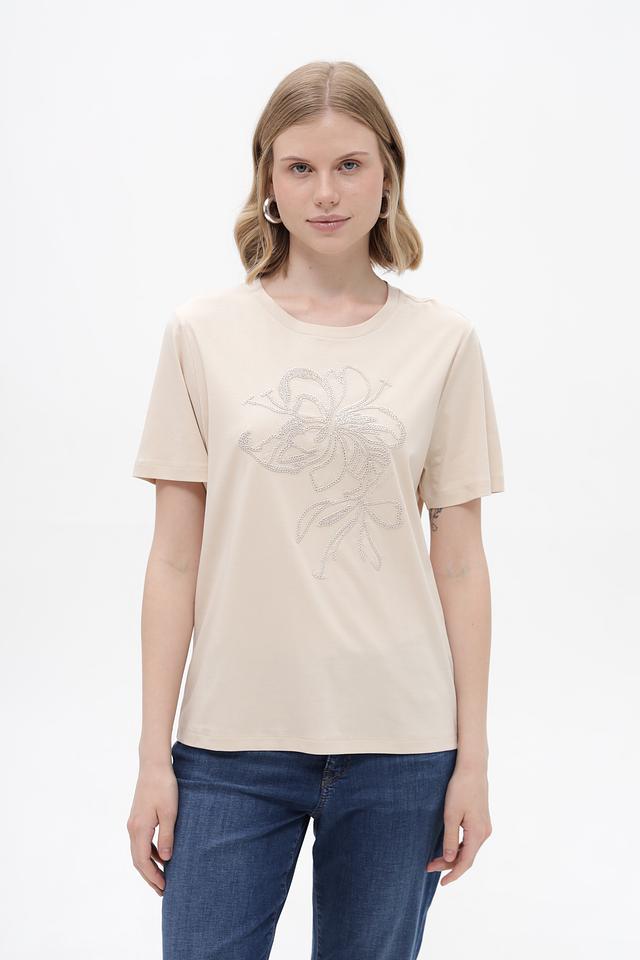 Женская футболка Marc Cain бежевого цвета, украшена вышивкой в виде цветка. Модель выполнена из 100% хлопка, обеспечивающего комфорт в носке. Состав: хлопок 100%