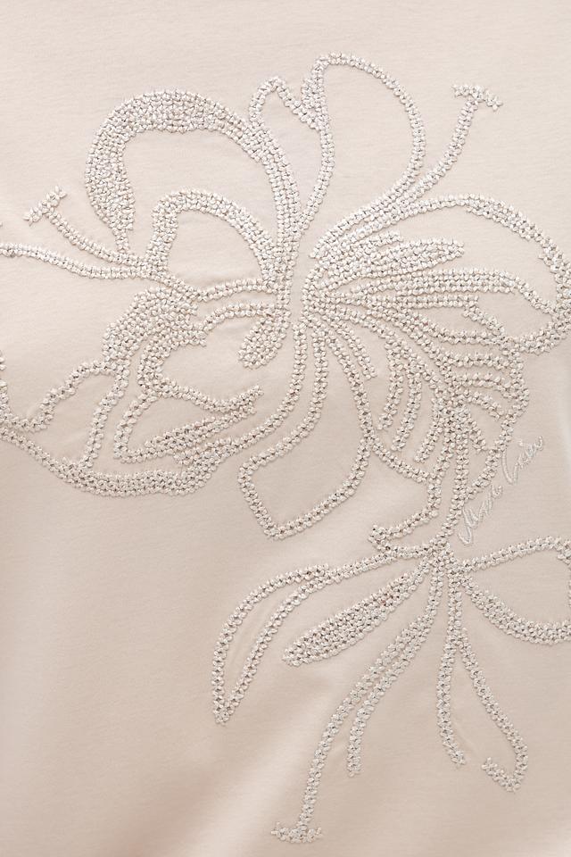 Основным акцентом модели является вышивка в виде изящного цветка, расположенная на лицевой стороне. Вышивка выполнена серебристыми нитями, что придает футболке элегантность и утонченность. Бежевый оттенок футболки легко сочетается с различными предметами гардероба, позволяя создавать разнообразные образы.