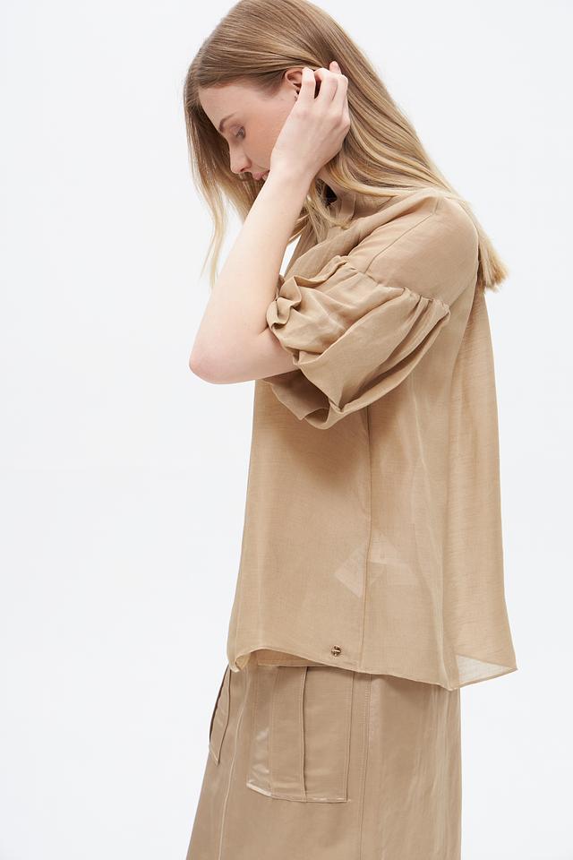 Бежевая блуза Marc Cain из льна и шёлка с рукавами-фонариками и вырезом-капелькой. Изделие выполнено из натуральных материалов, обеспечивающих комфорт и воздухопроницаемость. Состав: лен 55%, шелк 45%