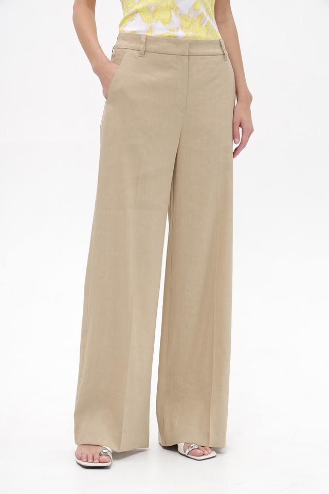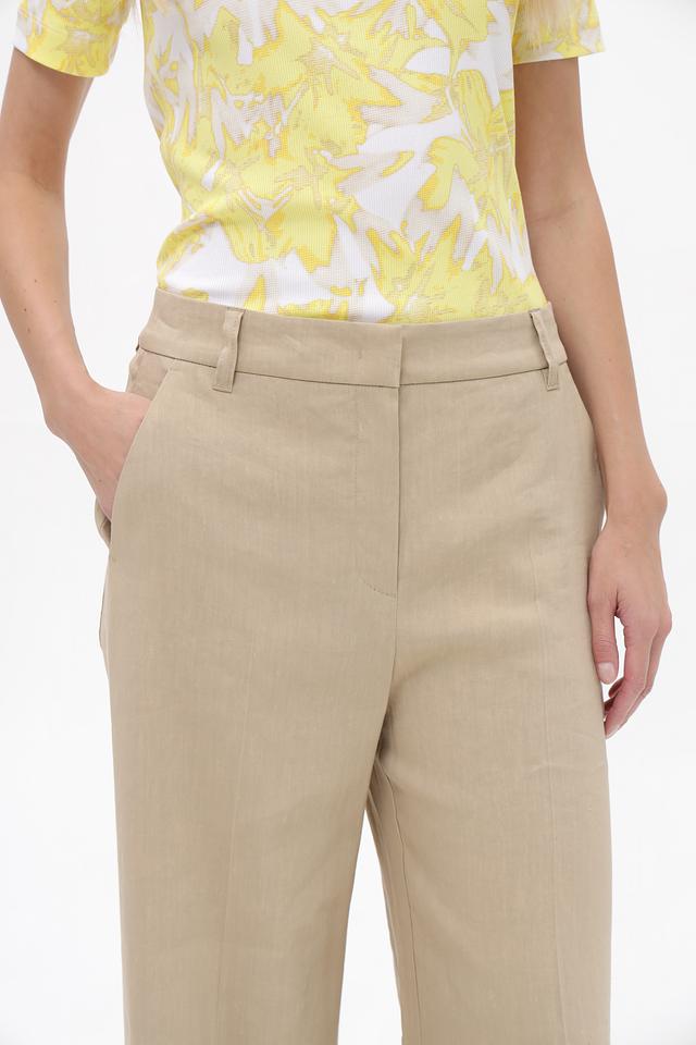 Модель выполнена из сочетания льна (62%) и вискозы (35%) с добавлением эластана (3%). Лен обеспечивает воздухопроницаемость и приятные тактильные ощущения, а вискоза придает ткани мягкость и драпируемость. Эластан обеспечивает небольшую эластичность для более комфортной посадки.