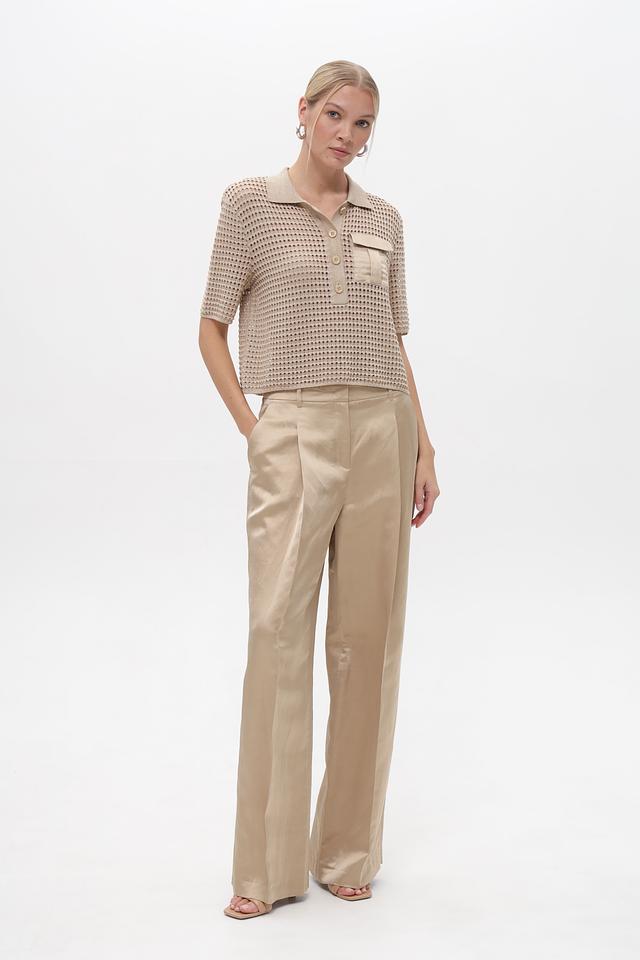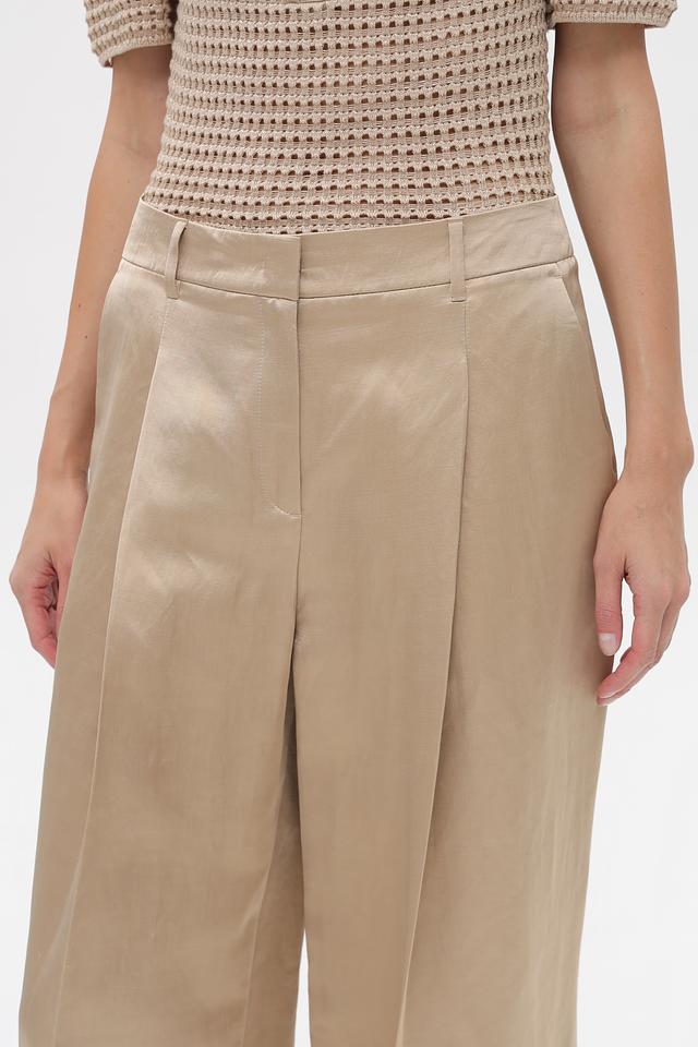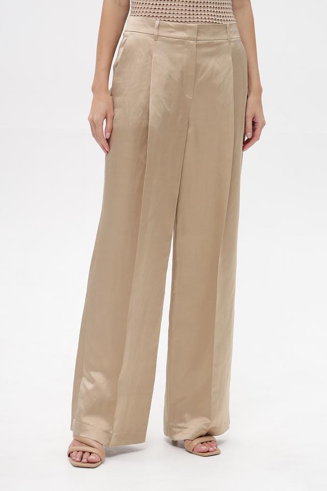 Брюки имеют высокую посадку и застегиваются на молнию и пуговицу. На передней части брюк расположены аккуратные складки, добавляющие модели изысканности.