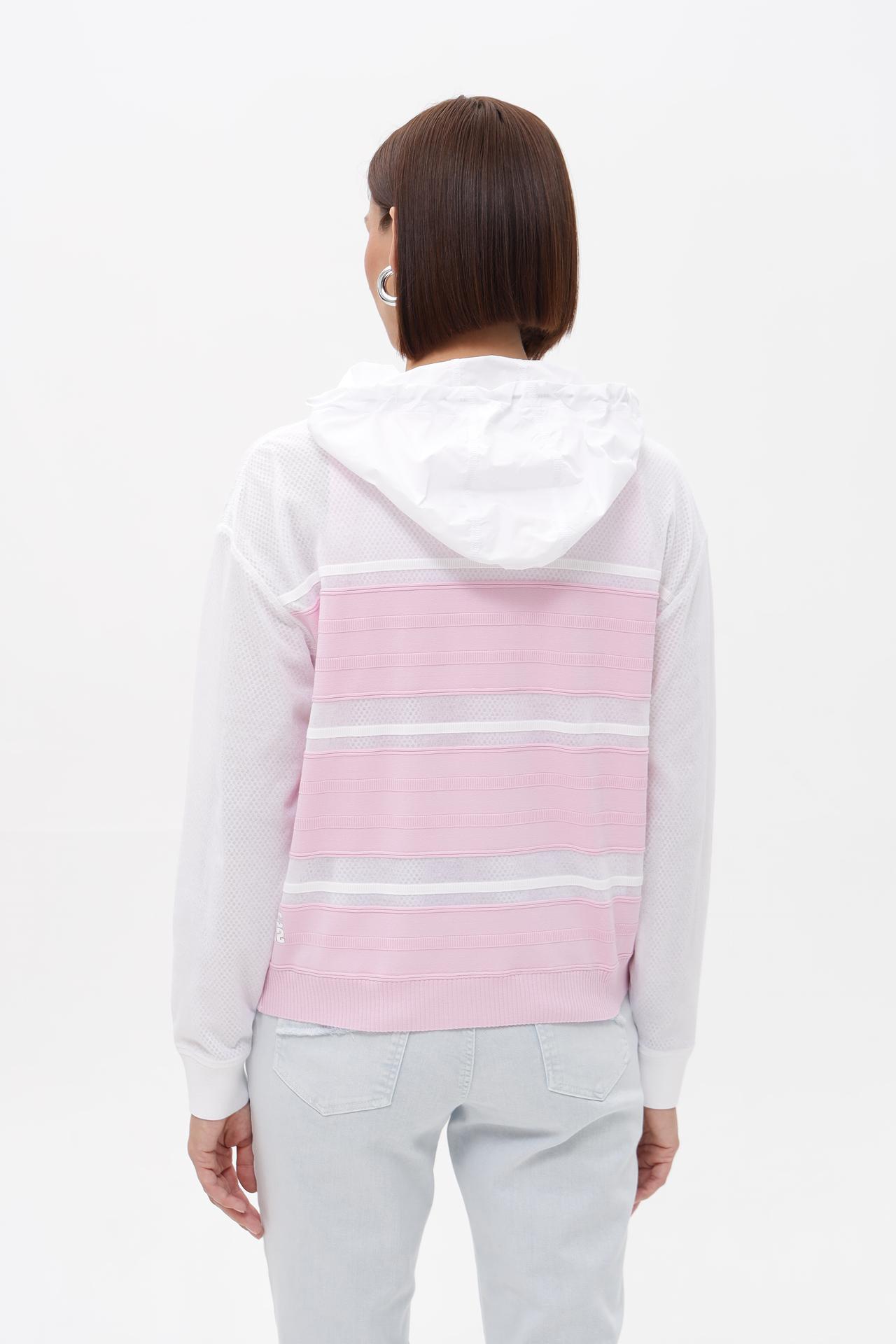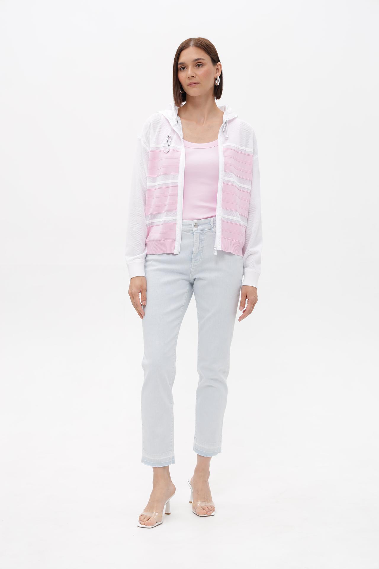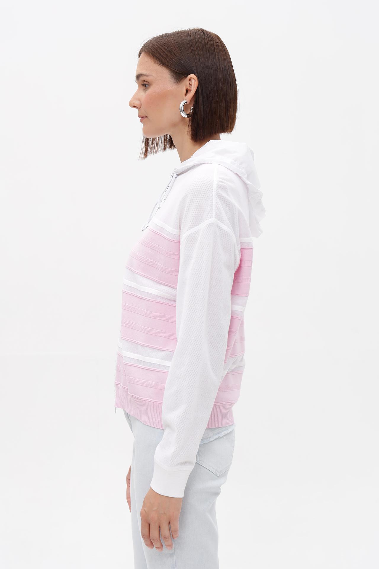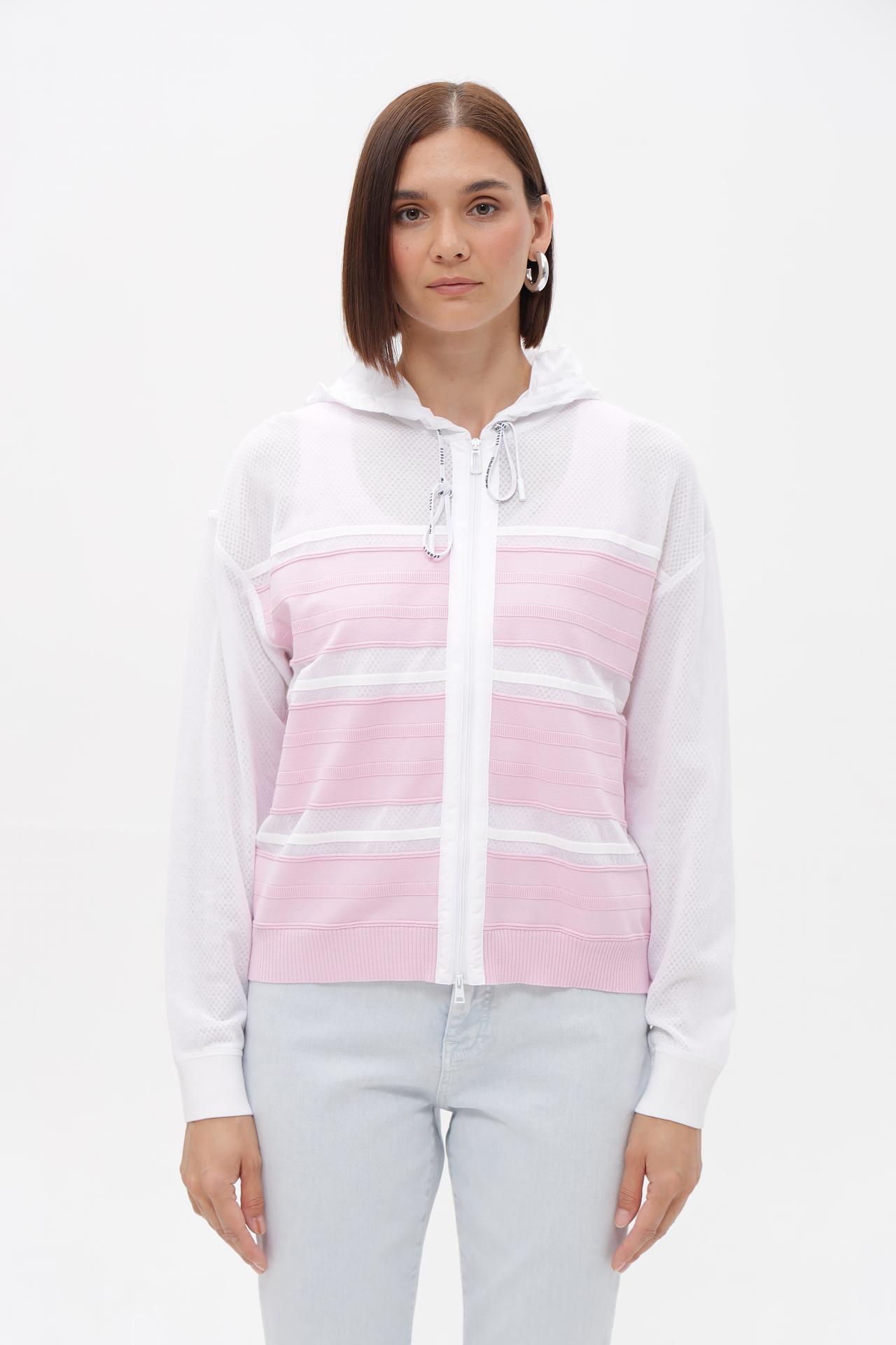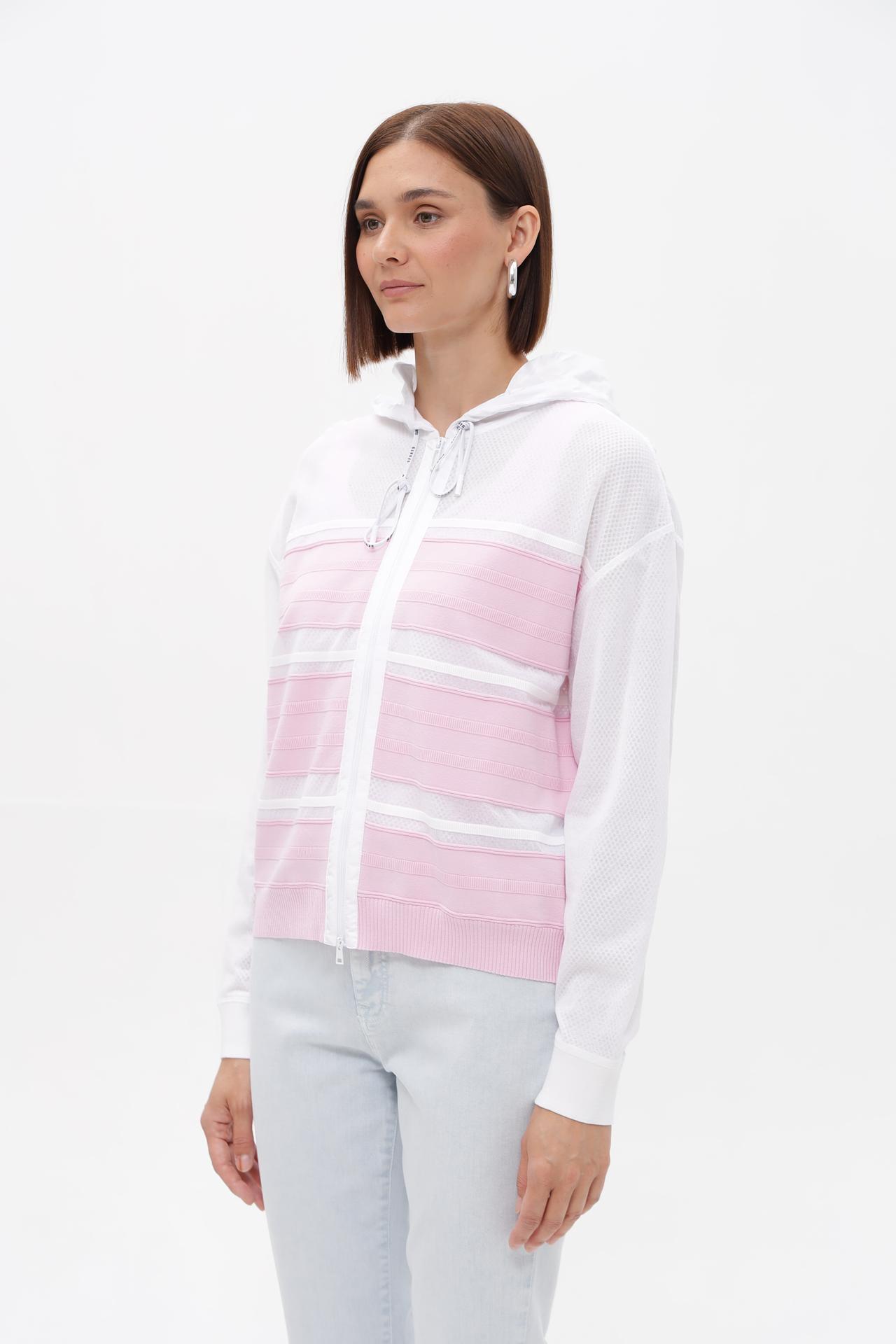 Элегантный жакет выделяется оригинальным дизайном с горизонтальными розовыми полосами на фоне белого сетчатого материала. Практичный капюшон и удобная застежка-молния по всей длине делают эту модель универсальной для повседневного гардероба.