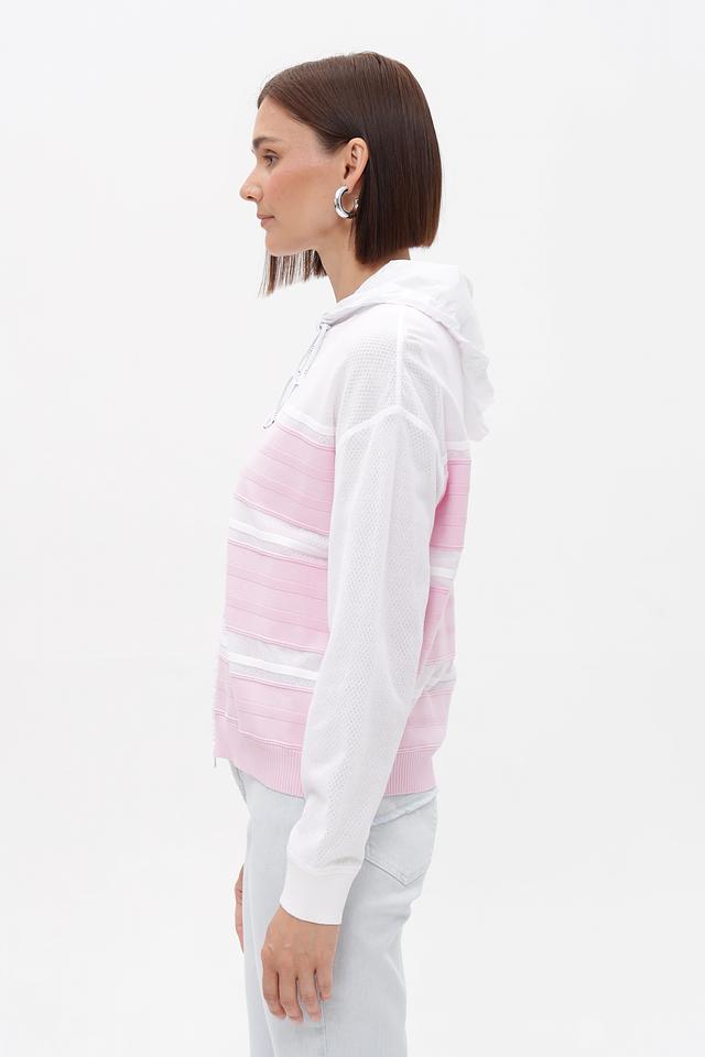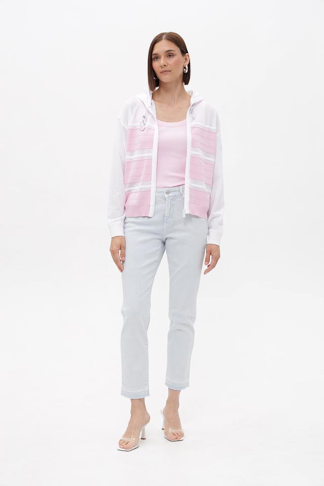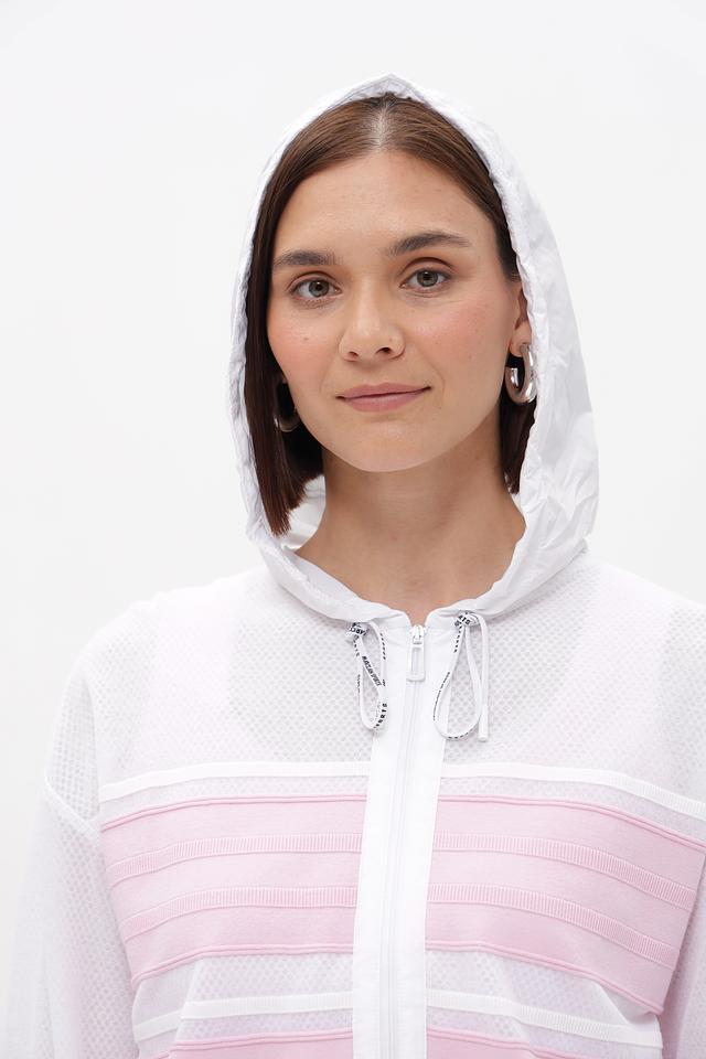 Женский жакет от бренда Marc Cain выполнен в нежном розовом цвете с контрастными белыми полосами. Модель имеет застежку на молнию и удобный капюшон со шнурками.