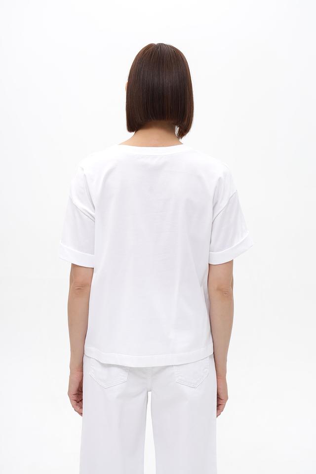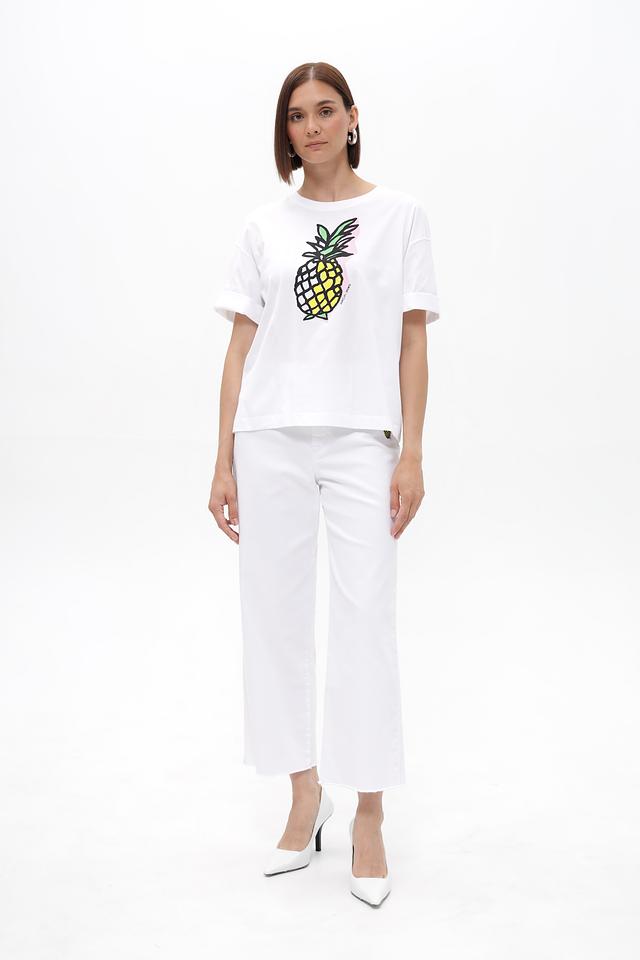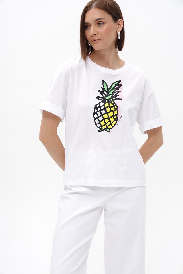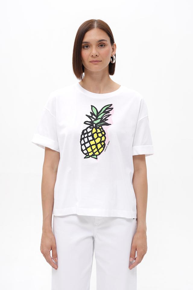 Белая футболка от Marc Cain с ярким принтом ананаса. Изготовлена из 100% хлопка, обеспечивающего комфорт в течение дня. Свободный крой и зауженные рукава. Состав: хлопок 100%