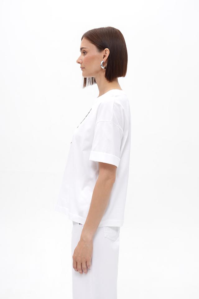 Футболка имеет свободный крой, который обеспечивает свободу движений и расслабленный силуэт. Короткие, слегка зауженные рукава добавляют образу лёгкости и непринужденности. Круглый вырез горловины классической формы.