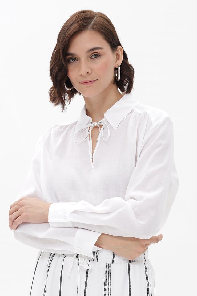 Блузка имеет классический воротник и длинные рукава с манжетами на пуговицах. Передняя часть украшена декоративными завязками на горловине, которые позволяют регулировать глубину выреза и создавать различные образы.