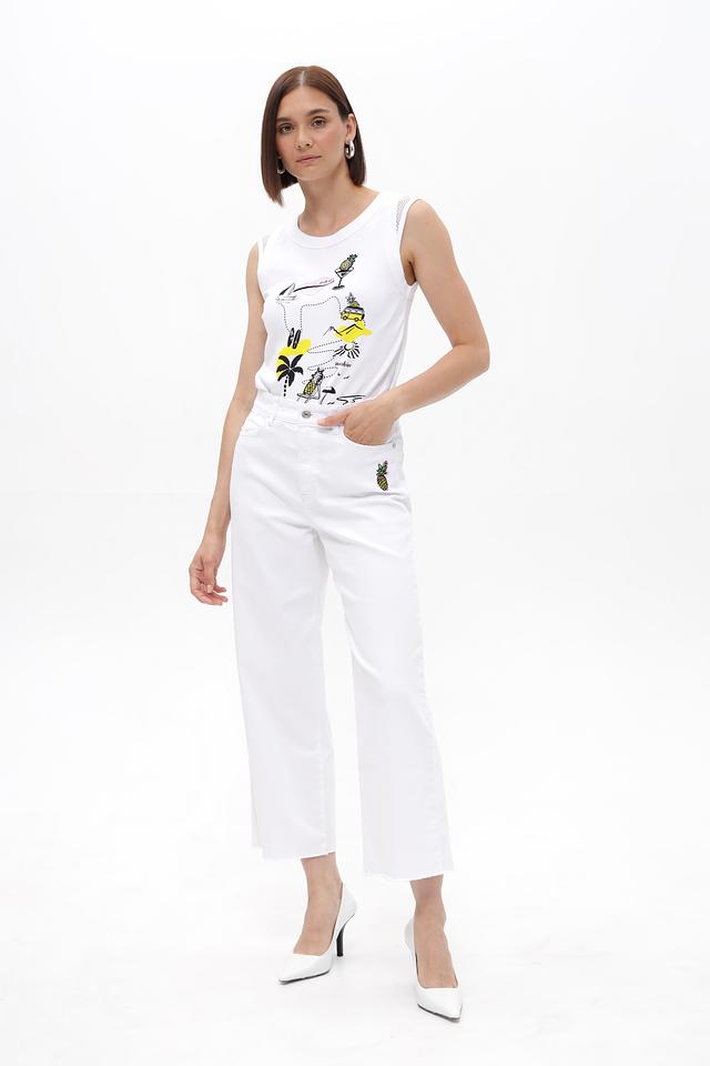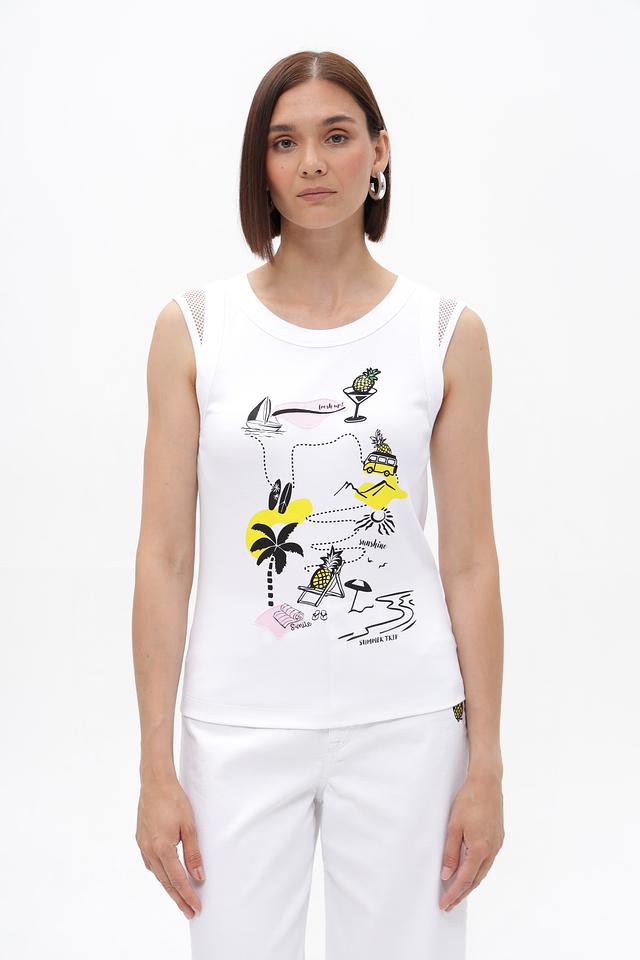 Белый летний топ Marc Cain из хлопка с ярким тропическим принтом. Модель выполнена из мягкого трикотажа с добавлением эластана для комфортной посадки. Идеальный выбор для создания лёгкого и стильного образа. Состав: хлопок 94%, эластан 6%