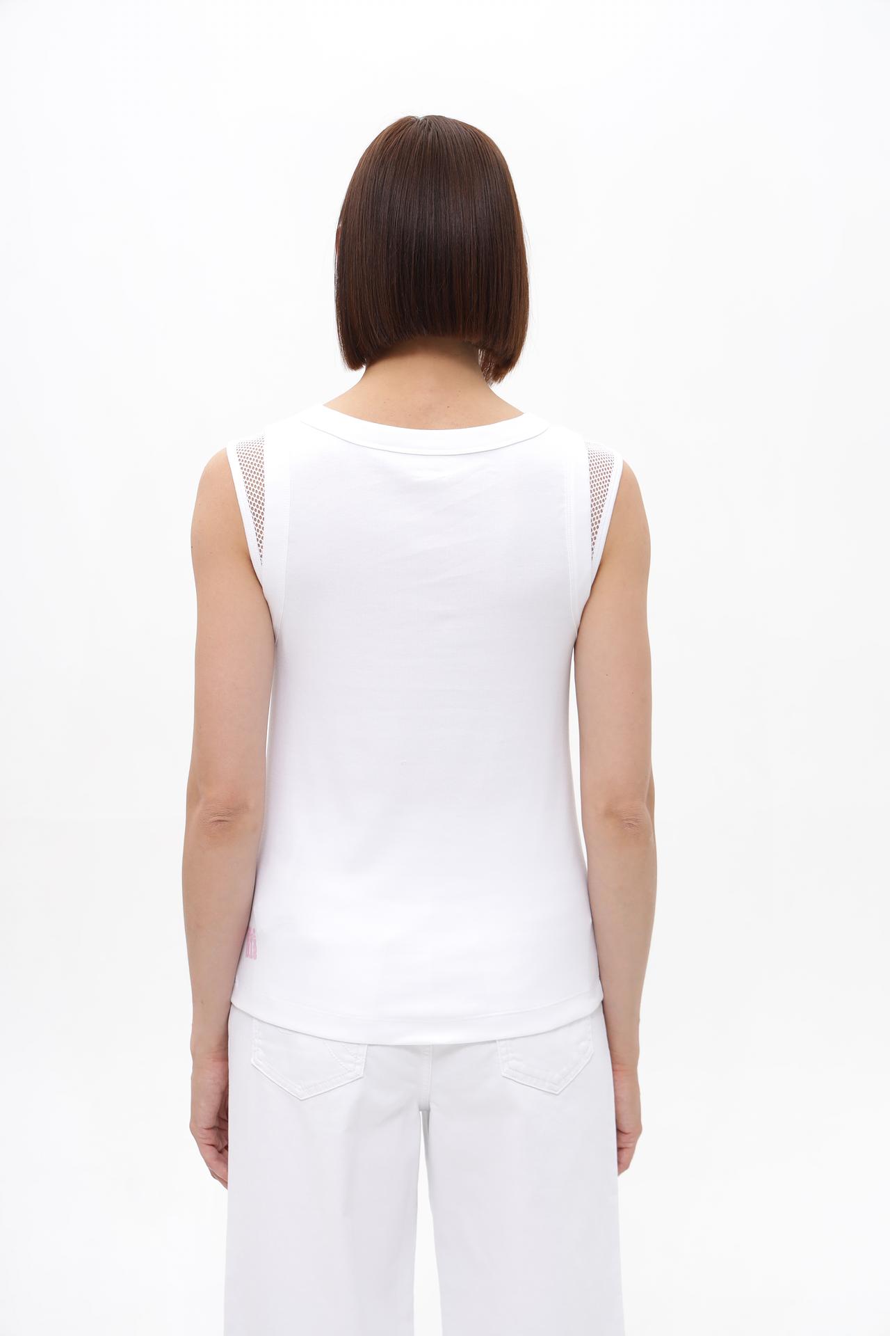 Изготовленный из приятного к телу трикотажа (94% хлопок, 6% эластан), топ обеспечивает исключительный комфорт и отличную посадку. Хлопок гарантирует воздухопроницаемость, а эластан — долговечность и сохранение формы. Сетчатые вставки на плечах добавляют современный акцент и легкость образу.